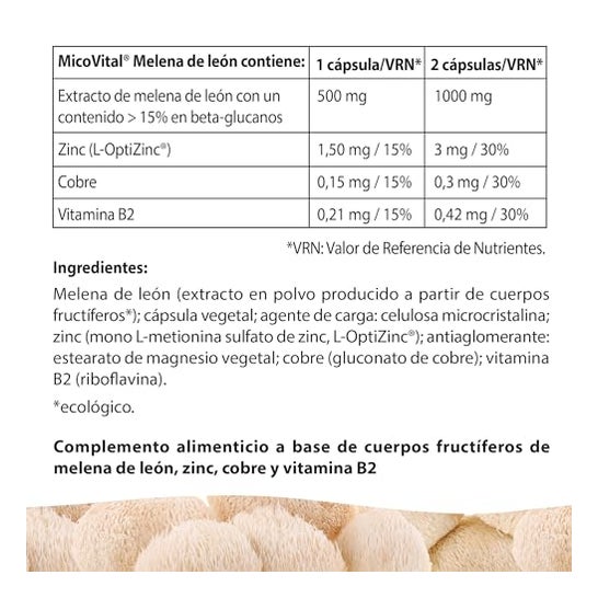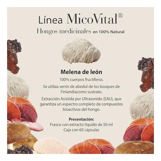 100% Natural Micovital Lion's Mane 60caps é um suplemento alimentar à base de Lion's Mane, cobre, zinco e vitamina B2. Ajuda a apoiar o sistema nervoso e neuronal, ajudando a fortalecer o sistema imunitário. Contém 60 cápsulas.