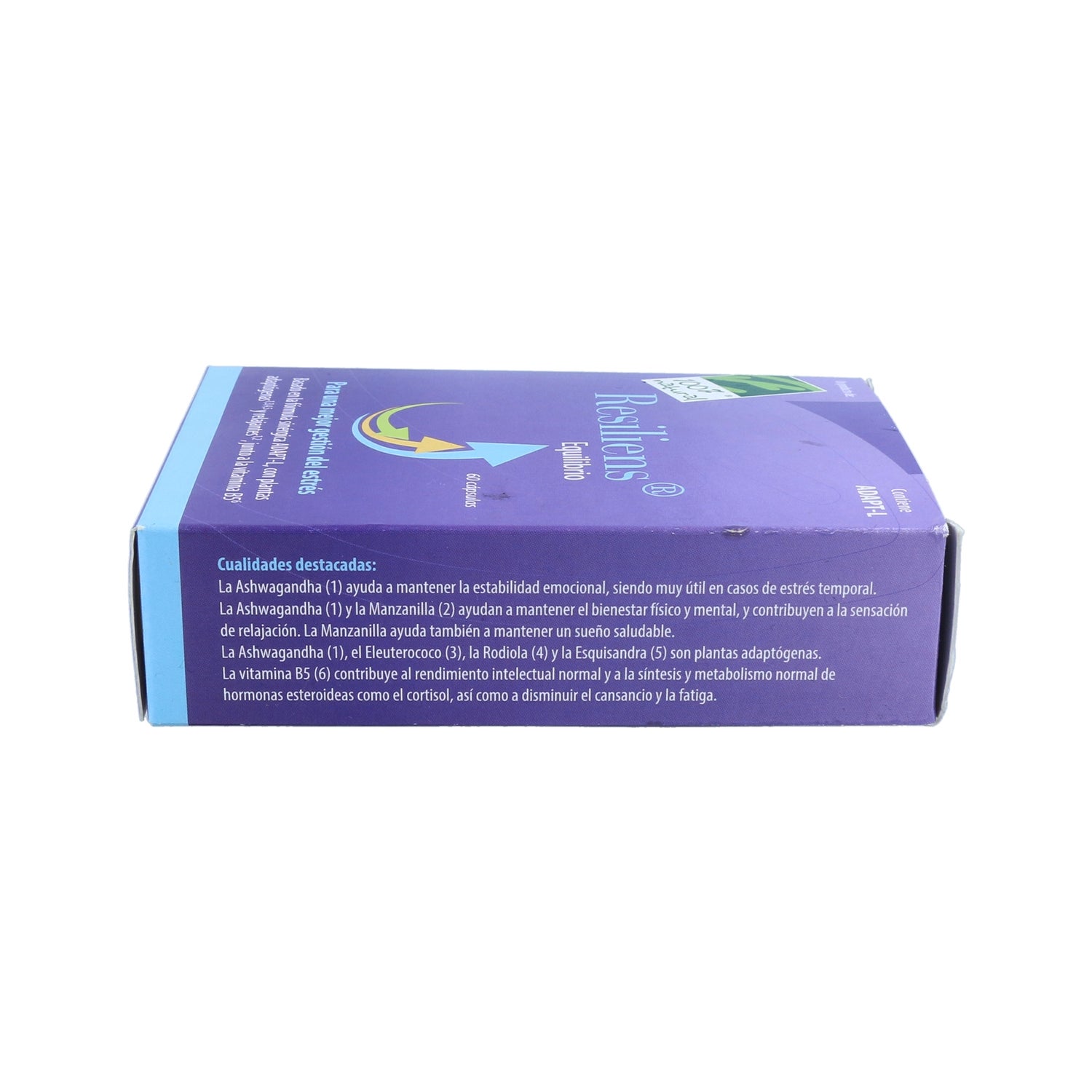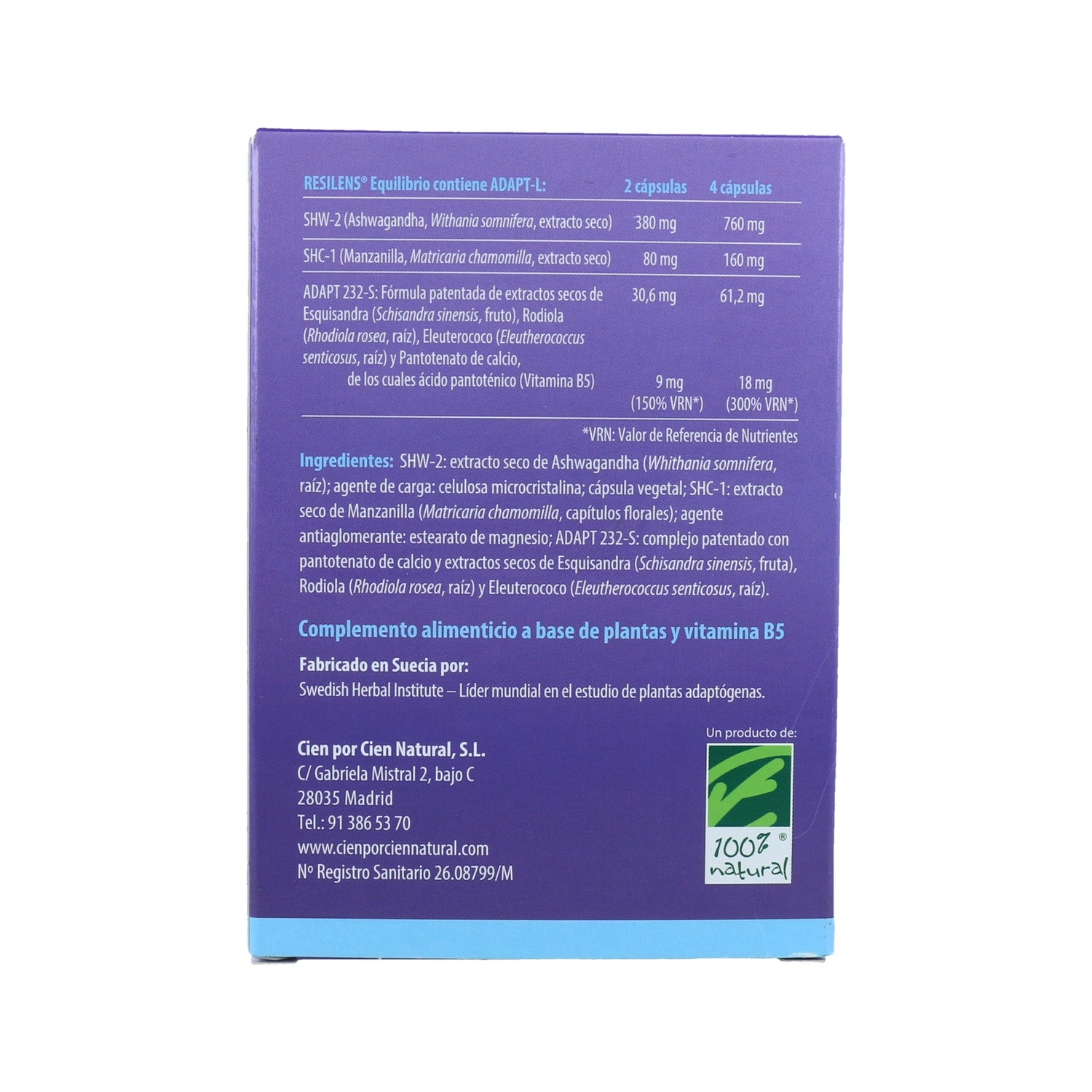 100% Natural Resiliens Equilibrio é um suplemento alimentar que ajuda o nosso corpo a gerir melhor o stress e a manter a estabilidade emocional e o bem-estar físico e mental.A sua combinação consiste em plantas adaptogénicas e relaxantes com vitamina B5. Esta formulação ajuda-nos a ultrapassar o stress diário, normalizando o ciclo do cortisol, ou seja, o repouso e a recuperação.