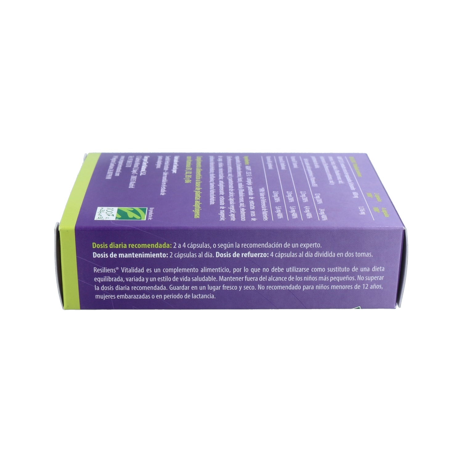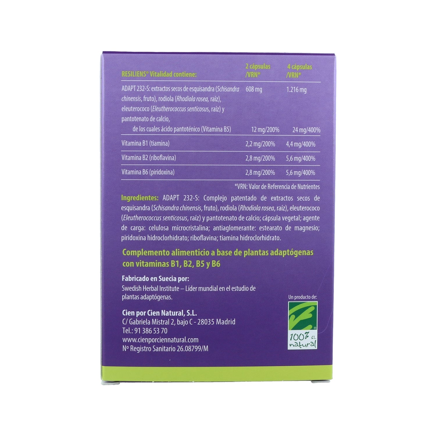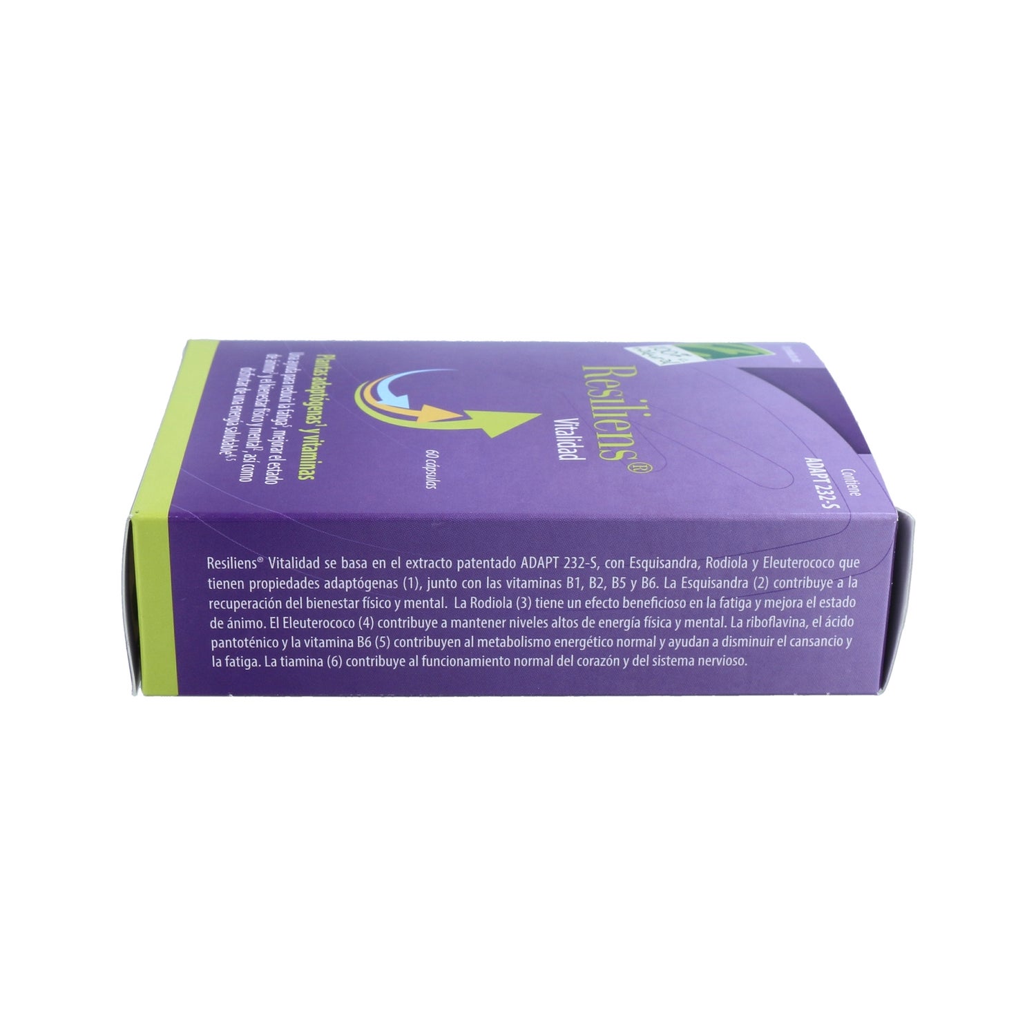 Complemento de vitalidade 100% Natural Resiliens Vitality especialmente concebido para reduzir a fadiga e assim melhorar o nosso bem-estar físico e mental. A sua fórmula patenteada de ADAPT-232S é composta por plantas adaptogénicas: Equisandra, Eleutherococcus e Rodiola, juntamente com as vitaminas B1, B2, B5 e B6. Este suplemento ajuda a reduzir os efeitos do stress, melhorando o nosso humor e reforçando a energia do nosso organismo.