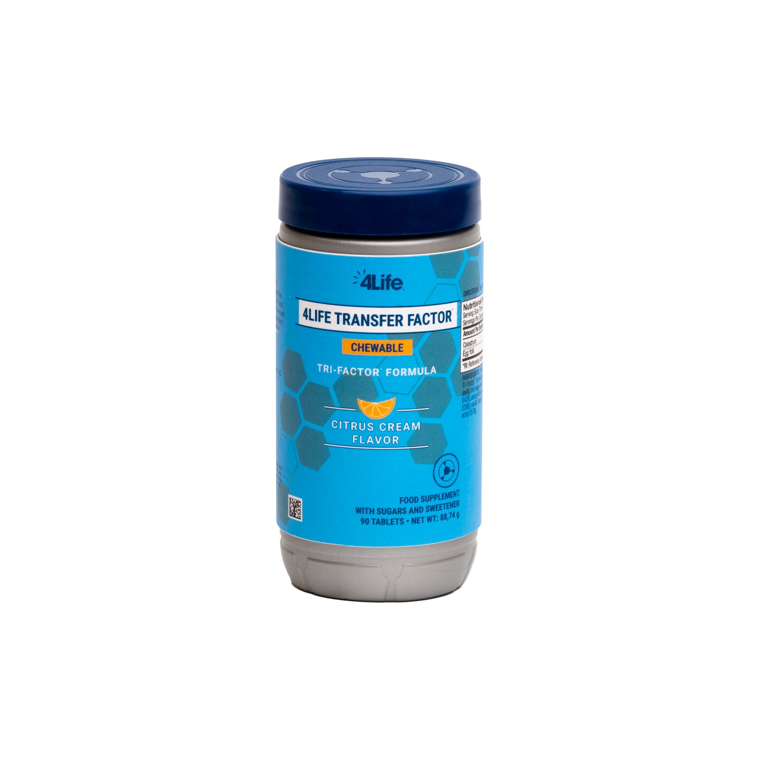 4Life Transfer Factor Chewable Tri-Factor Formula 90comp é um complemento alimentar que inclui colostro bovino e gema de ovo em uma forma mastigável e saborosa. Este produto foi projetado para facilitar seu consumo, permitindo uma experiência agradável.