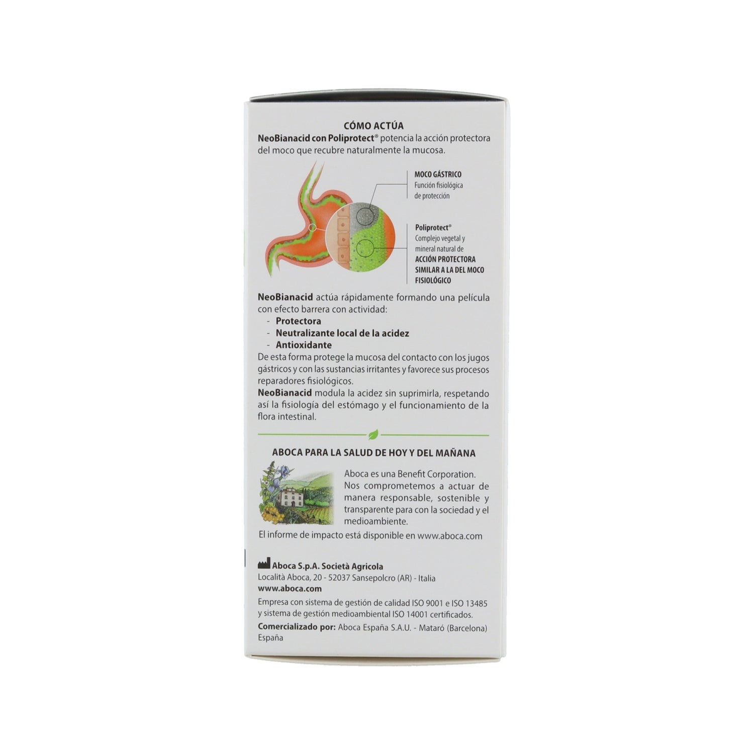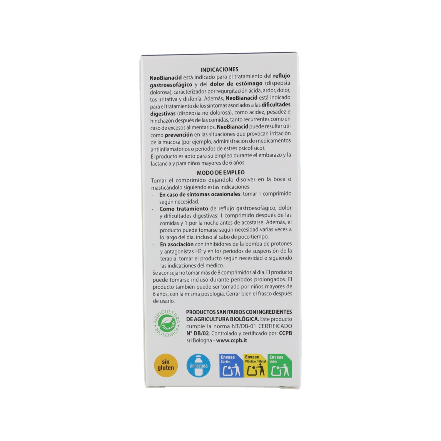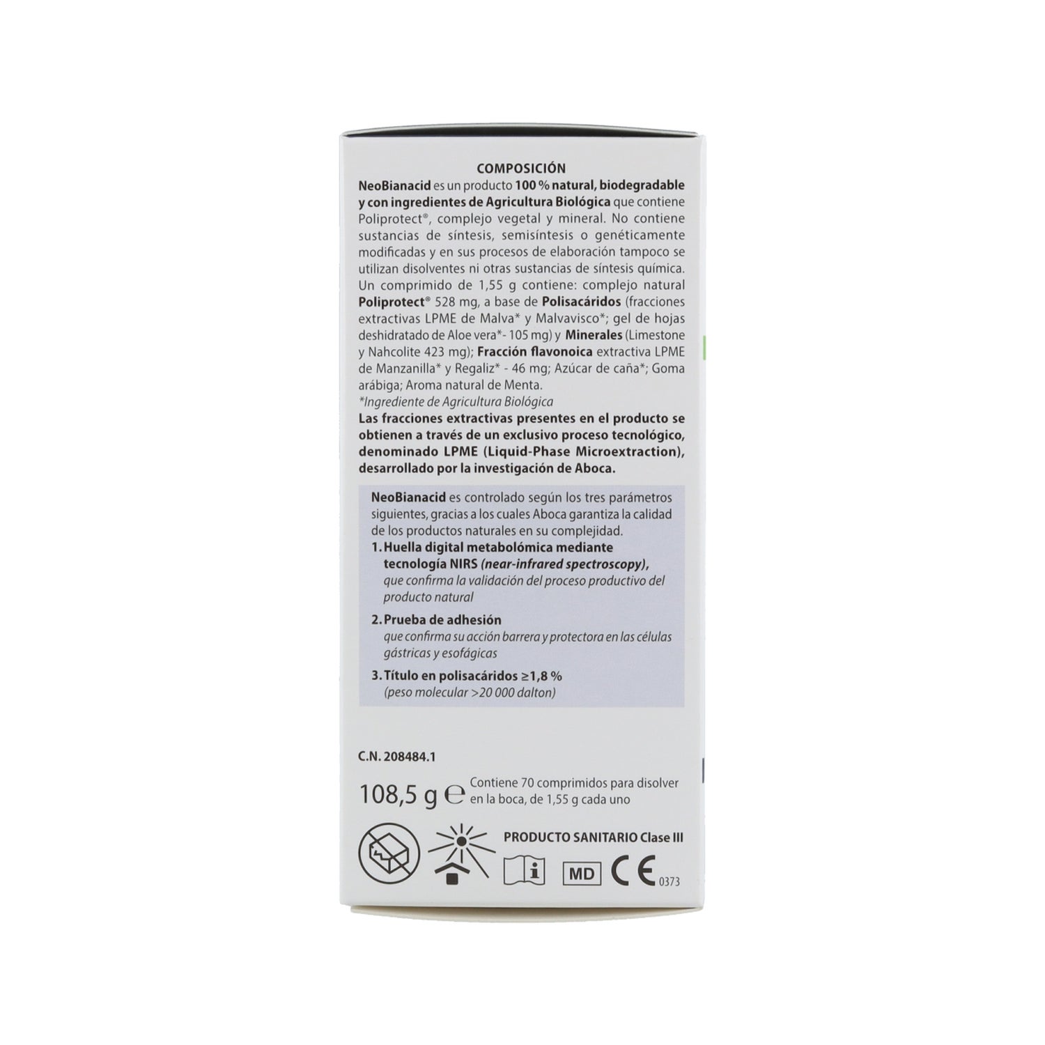 Aboca NeoBianacid Sabor a Menta 70comp é um suplemento alimentar em comprimidos que ajuda a combater a azia e a sensação de acidez. Pode ser tomado em caso de perturbações da azia, tais como ardor, dor, refluxo gastro-esofágico e gastrite, azia e sensação de peso.