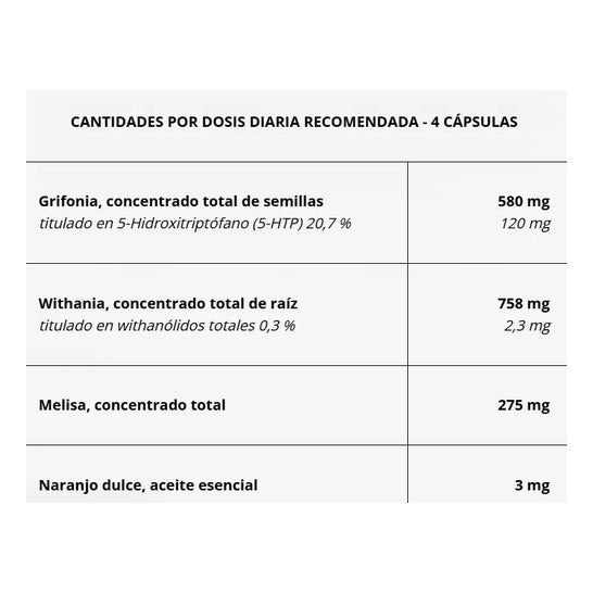 Withania (Withania somnifera), pó de raízes; Gelatina; Griffonia (Griffonia simplicifolia), extracto de sementes liofilizadas; Griffonia (Griffonia simplicifolia), pó de sementes; Melissa (Melissa officinalis), pó de folhas; Withania (Withania somnifera), extracto de raízes liofilizadas; Melissa (Melissa officinalis), extracto de folhas liofilizadas; Laranja doce, óleo essencial.