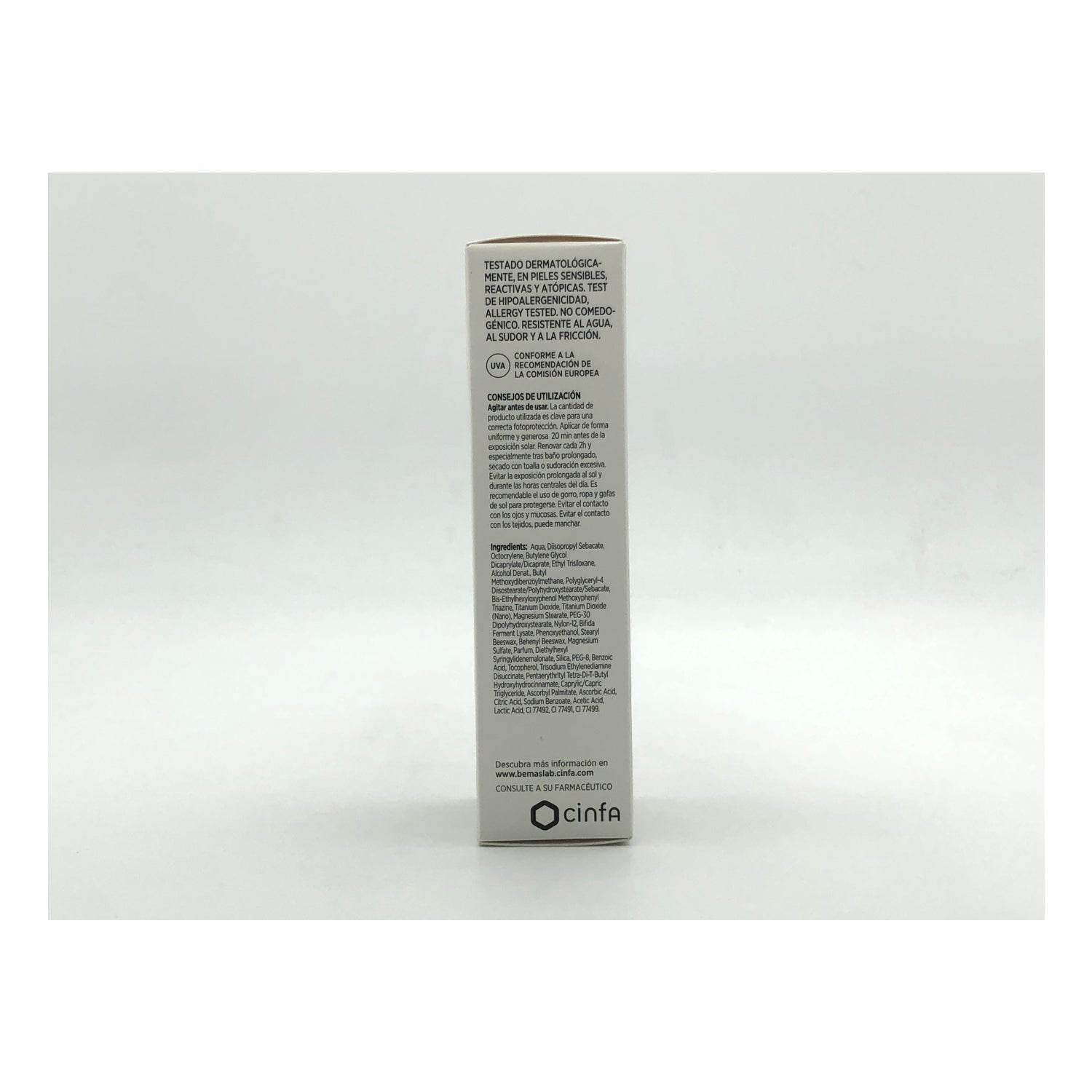 O produto tem um nível de fator SPF50+. É fácil de aplicar graças ao formato de spray ou bruma, e é muito resistente à água. Além disso, não contém perfume nem parabenos.