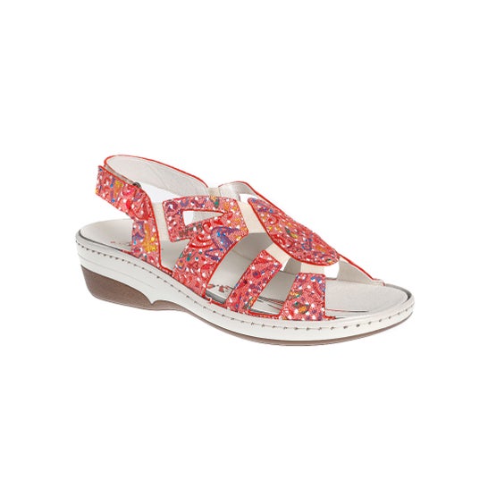 São sandálias para mulher muito confortáveis. São fáceis de calçar graças aos seus múltiplos ajustes elásticos e ao seu fecho de velcro na tira traseira. São flexíveis, leves e têm uma palmilha removível. São feitas de pele lisa vermelha com pequenos motivos estampados em branco, verde, azul e amarelo. A parte interior da sandália e a sola são brancas. A sola é de borracha e tem uma largura padrão e um salto de três centímetros: a altura ideal para cuidar da coluna vertebral. Esta sandália da Adour é indicada para pés sensíveis e não exerce qualquer pressão sobre eles. A palmilha é microperfurada para permitir que os pés respirem. Pode-se adaptar uma palmilha ortopédica ao retirar a que vem com ela. É um calçado terapêutico ideal para os meses de verão.