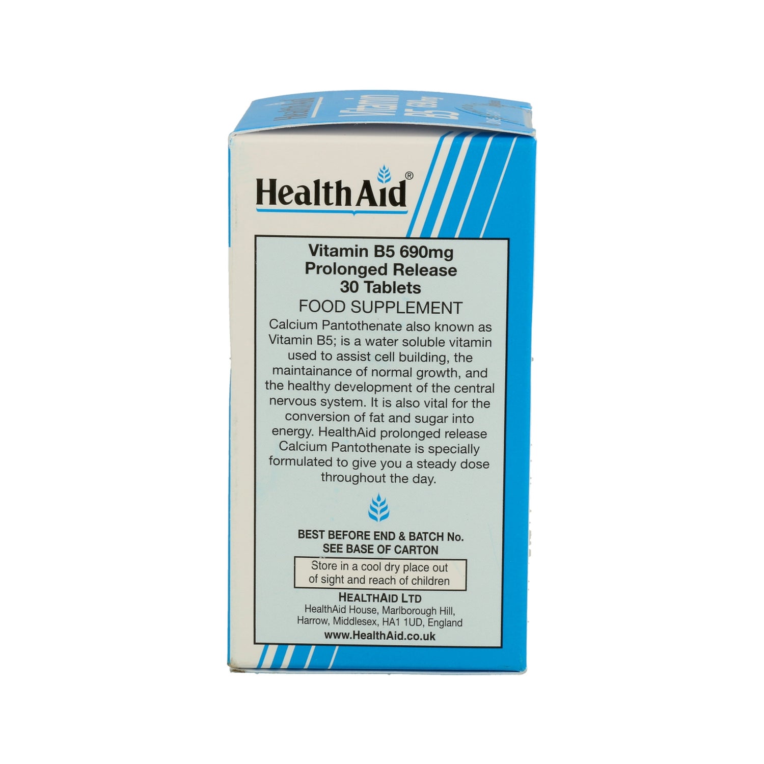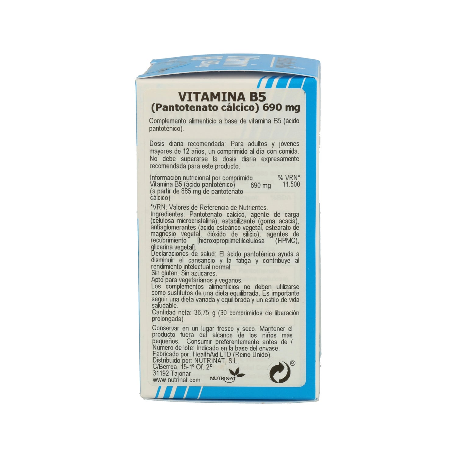 Suplemento alimentar em comprimidos de libertação prolongada que contém vitamina B5 ou ácido pantoténico. A vitamina B5 é uma vitamina do grupo B que, tal como as outras, actua no metabolismo dos hidratos de carbono e na produção de energia. A vitamina B5 é importante para ajudar a manter o nosso sistema imunitário, para ajudar a manter um coração saudável e os níveis correctos de colesterol. Além disso, a vitamina B5 ou pantotenato de cálcio está envolvida no metabolismo dos alimentos para produzir energia e desempenha um papel importante na produção da coenzima A. Adequado para adultos e jovens com mais de 12 anos de idade.