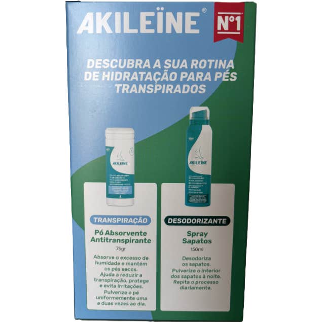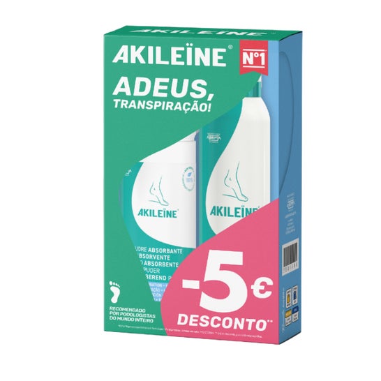 - Akileïne Polvo Absorbente Antitranspirante 75g: um pó absorvente que desodoriza, reduz e absorve a transpiração dos pés desde a primeira aplicação. É perfeito para aquelas pessoas que sofrem de odores fortes nos pés, pois perfuma e inclui ativos com funções antibacterianas e dermoprotectoras.