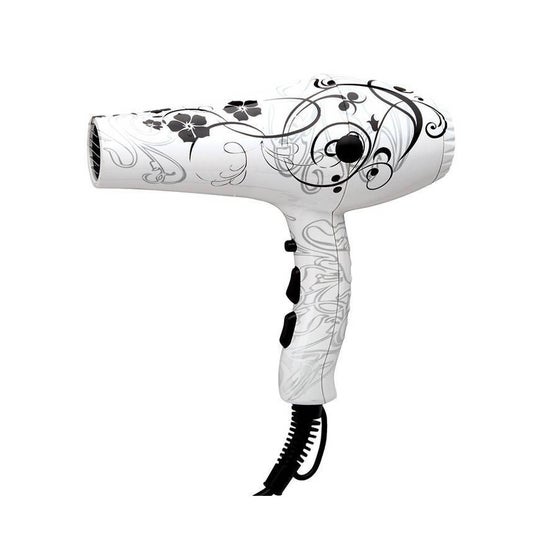 Secador de cabelo branco com desenho floral. Tem um motor CA profissional com longa vida útil. Tem grande potência e longa vida útil, um cabo de 3m de comprimento e um filtro destacável. Permite 2 velocidades, 3 temperaturas e jacto de ar frio. Inclui dois bocais concentradores e um difusor. Design moderno e atractivo.
