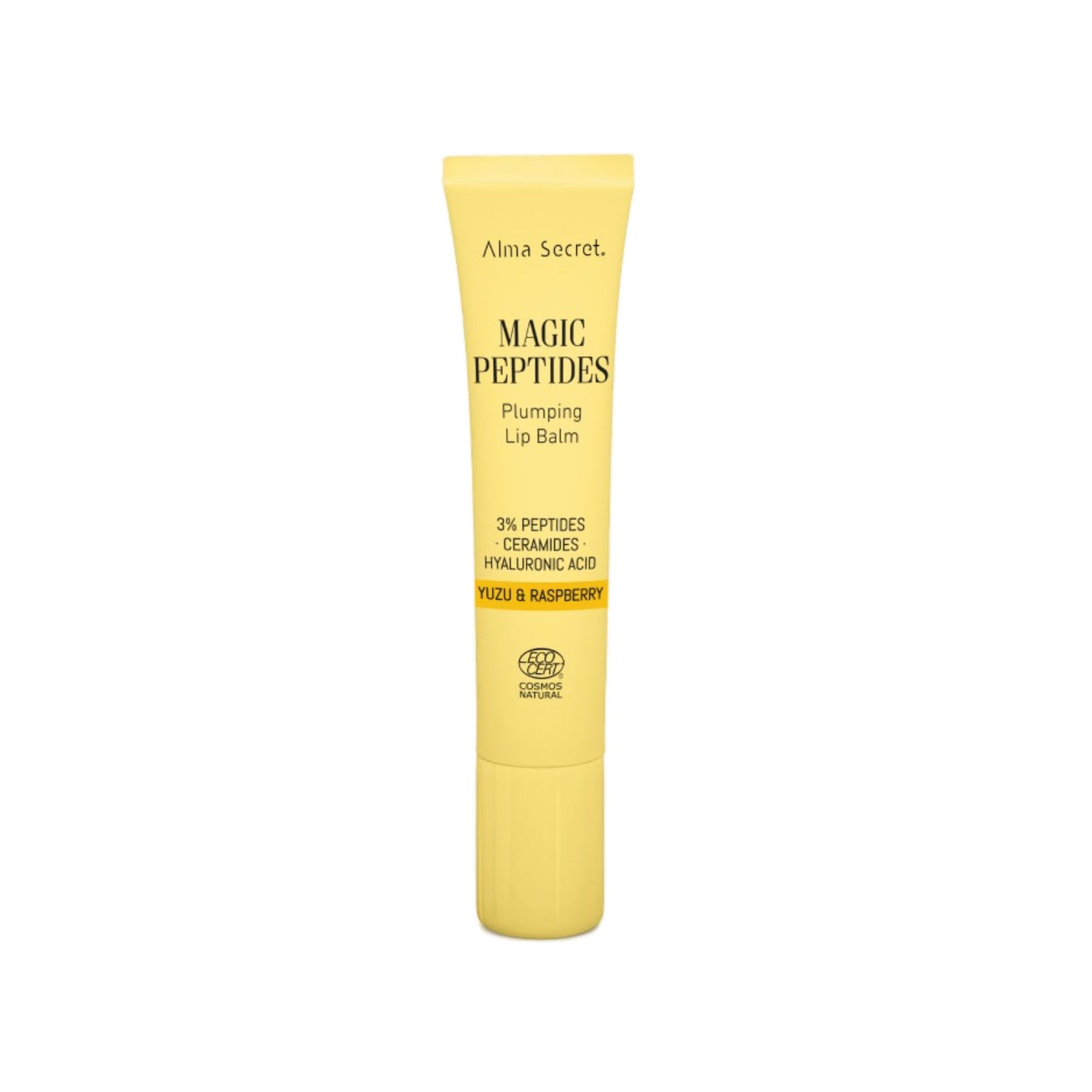 Alma Secret Magic Peptides Bálsamo Labial 3 em 1 é completamente natural, vegano e possui certificação Ecocert Cosmos Natural, garantindo seu compromisso com ingredientes de origem ecológica e práticas sustentáveis.