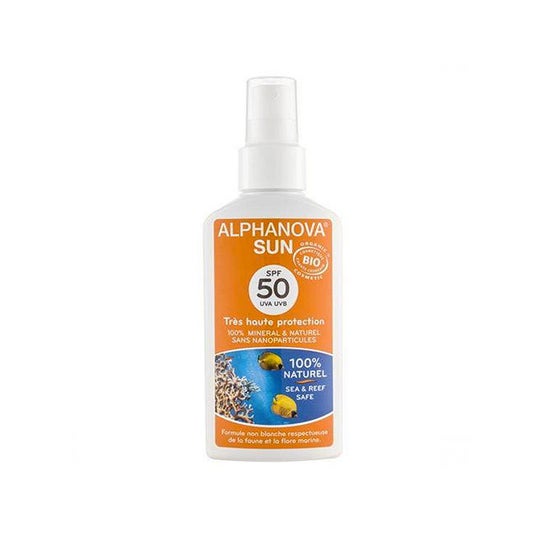 Protetor solar em spray com SPF50+ vegan de origem e agricultura natural e biológica. Não contém filtros químicos, parabenos, conservantes, fragrâncias ou óxido de zinco. A sua fórmula hipoalergénica é adequada para peles sensíveis e reactivas. Este produto de origem natural protege a pele dos raios UVA-UVB e hidrata e acalma a pele. A sua fórmula natural não polui o ambiente marinho. Resistente à água.