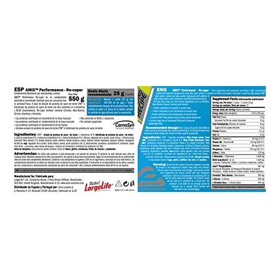 AMIX™ Performance Re-Cuper é um suplemento alimentar concentrado concebido para ser consumido após a atividade física. À base de proteína isolada de soro de leite CFM® e hidrolisado de proteína de soro de leite com um elevado teor de L-Glutamina e BCAAs (instantâneos). Re-Cuper contém ainda Citrulina, Beta-Alanina, Glicina, vitaminas e minerais.