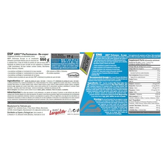AMIX™ Performance Re-Cuper é um suplemento alimentar concentrado concebido para ser consumido após a atividade física. À base de proteína isolada de soro de leite CFM® e hidrolisado de proteína de soro de leite com um elevado teor de L-Glutamina e BCAAs (instantâneos). Re-Cuper contém ainda Citrulina, Beta-Alanina, Glicina, vitaminas e minerais.