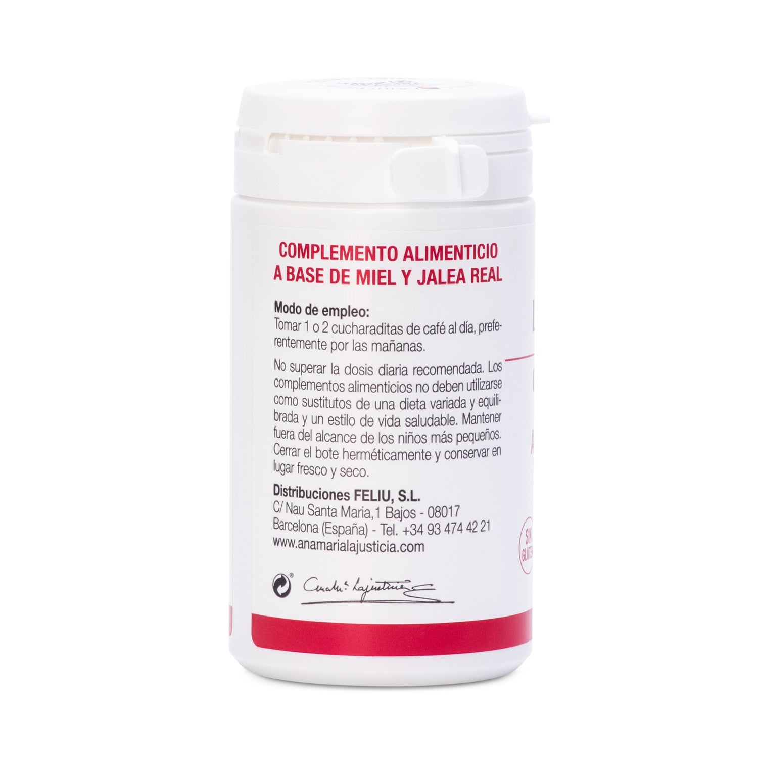 A geleia real com mel de LaJusticia irá fornecer-lhe um fornecimento adicional de vitaminas B (B1, B2, B3, B6 e B12) que o ajudarão a equilibrar os nutrientes do seu corpo. Além disso, a geleia real tem propriedades tonificantes e estimulantes que o revitalizarão em tempos de stress ou decadência.
