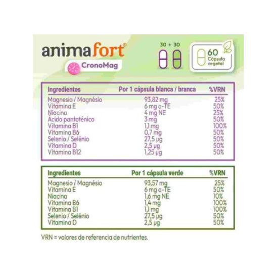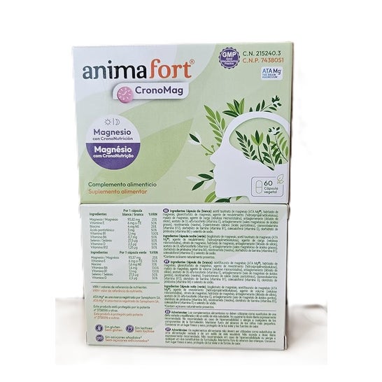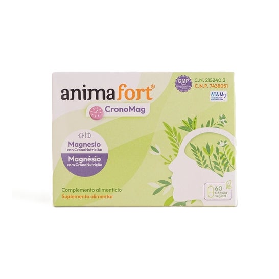 AnimaFort® CronoMag é um complemento alimentar projetado sob os princípios da crononutrição. Sua fórmula combina 6 fontes de magnésio de alta biodisponibilidade junto com vitaminas e minerais, distribuídos em duas doses (dia e noite) para otimizar sua absorção e eficácia de acordo com os ritmos biológicos do corpo.