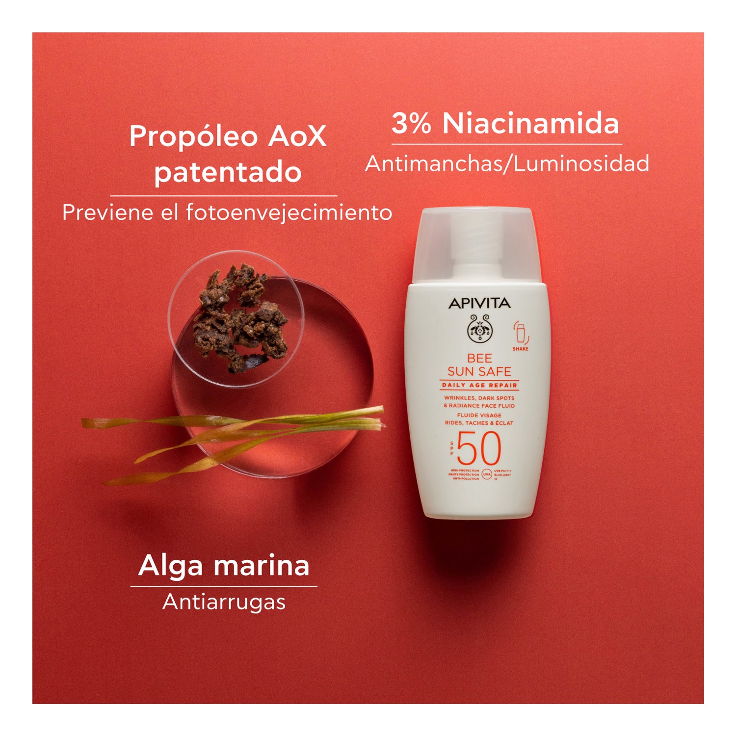 A ação deste produto se baseia em propólis AoX patenteado, algas marinhas e niacinamida, que trabalham em conjunto para fortalecer a barreira cutânea e combater os sinais da idade. Entre seus principais benefícios estão: