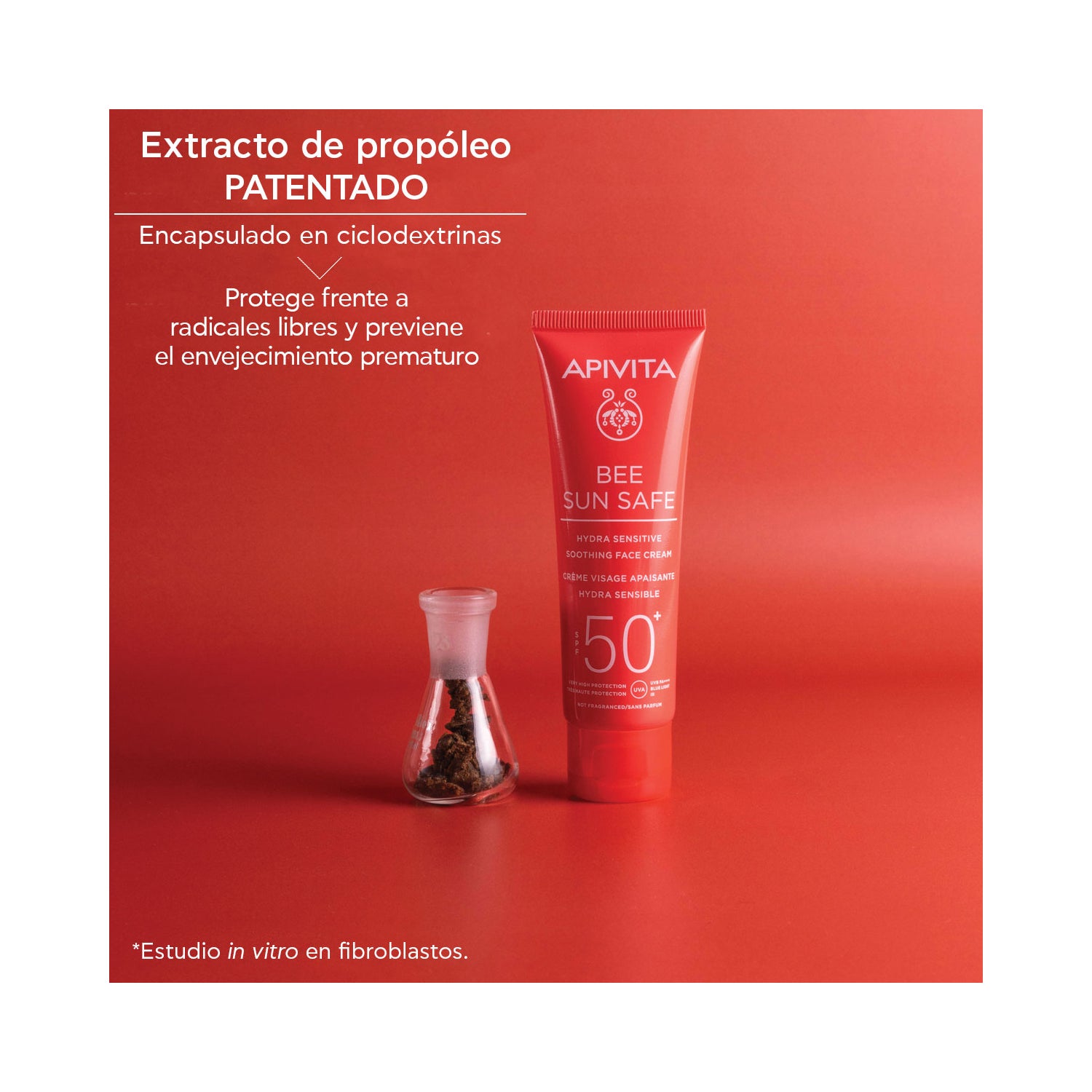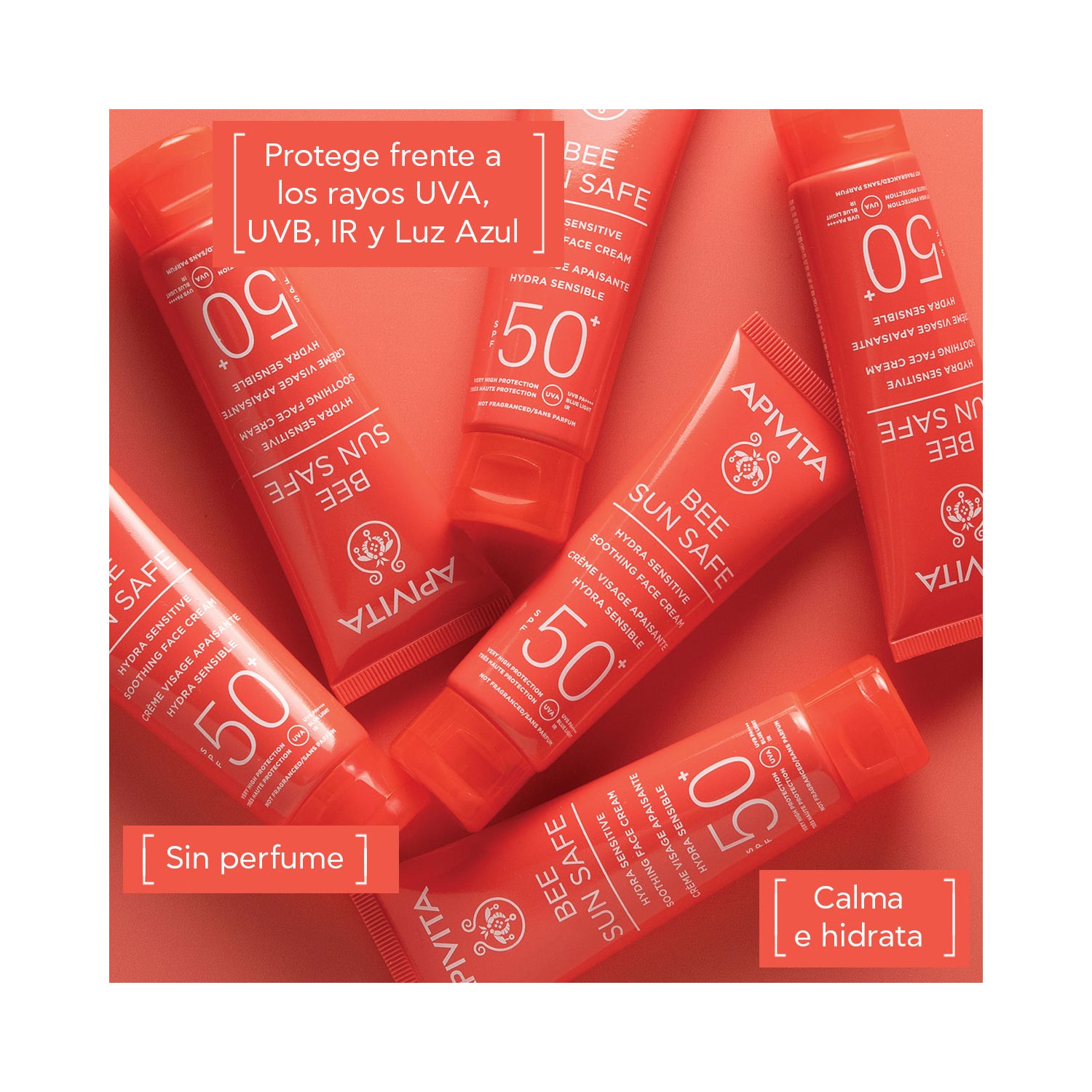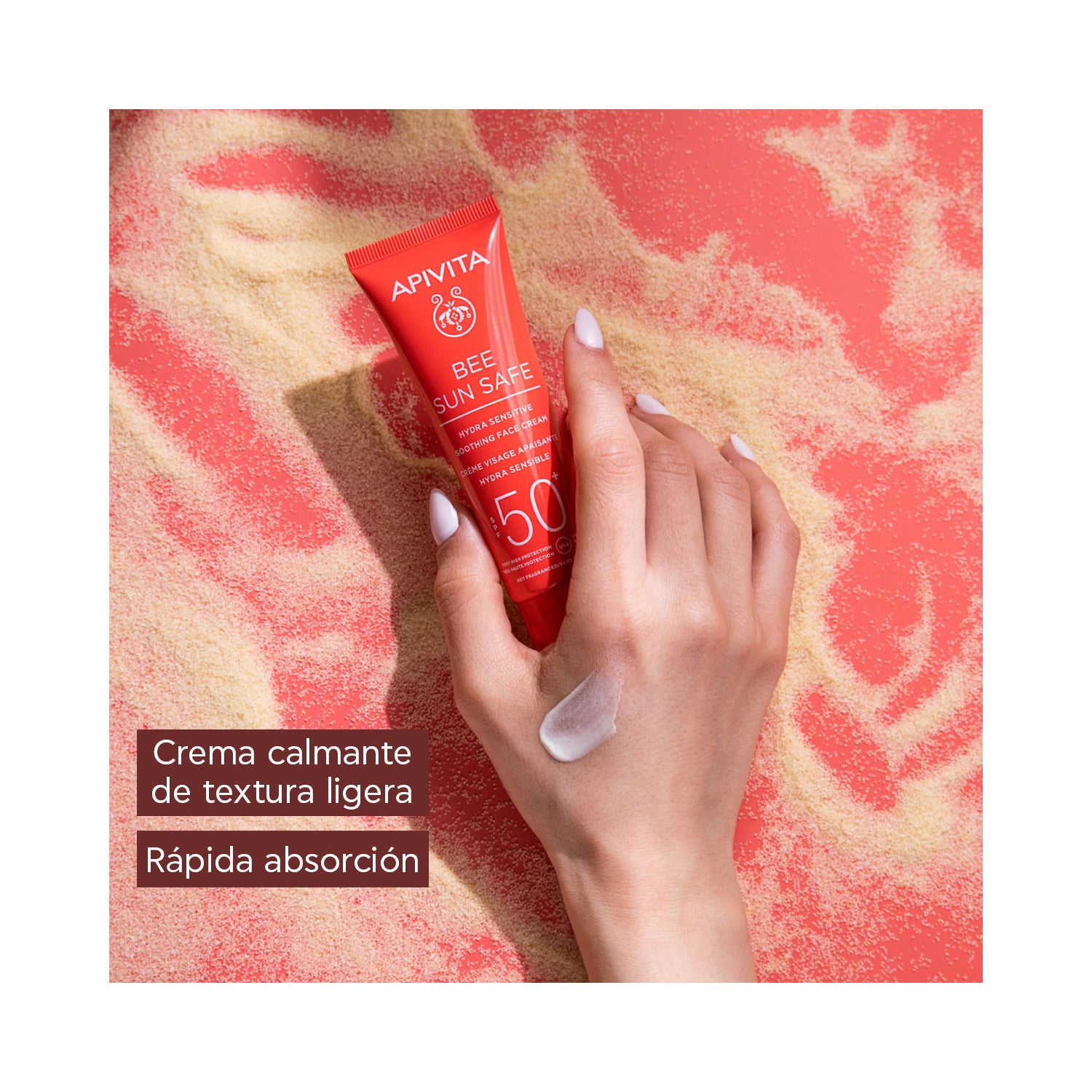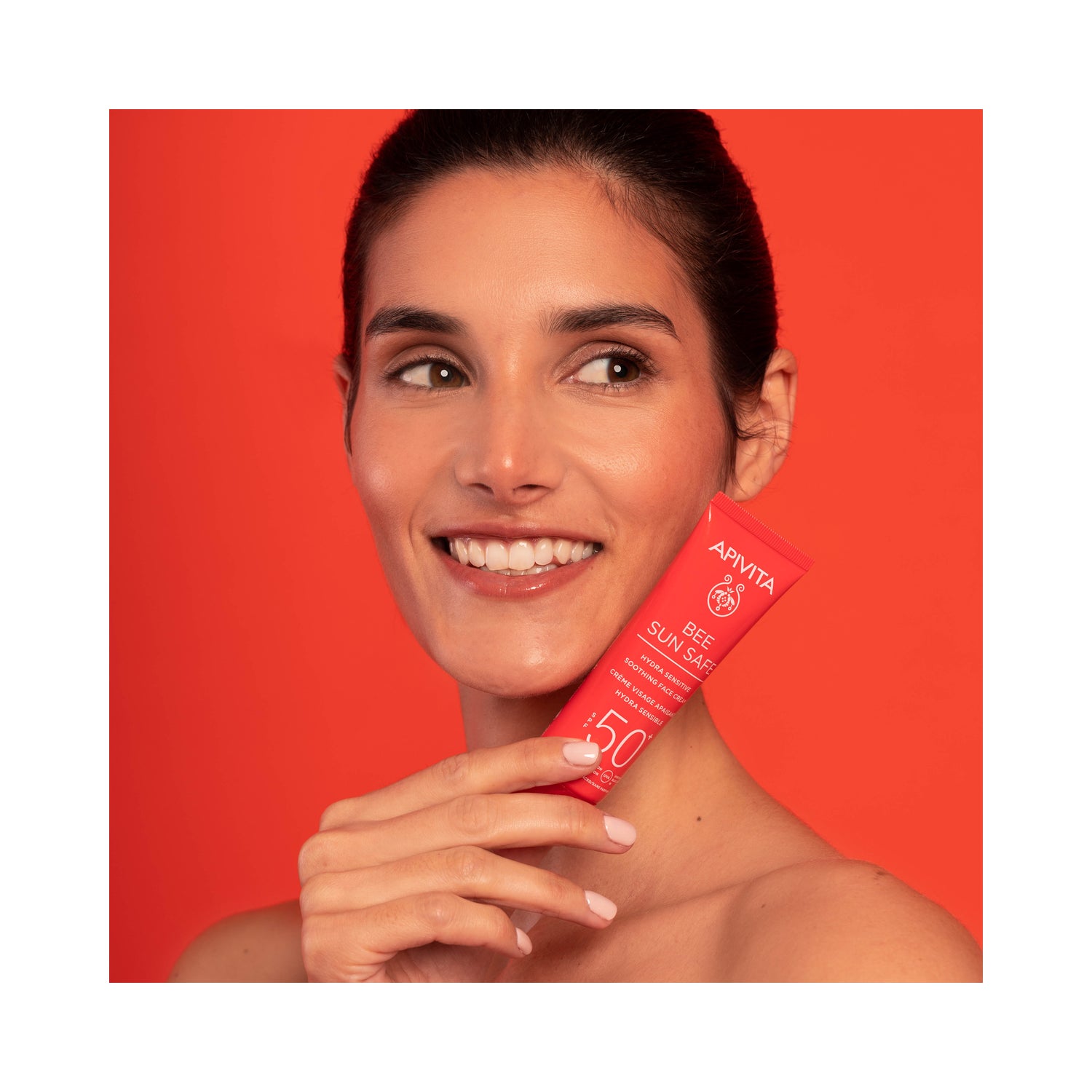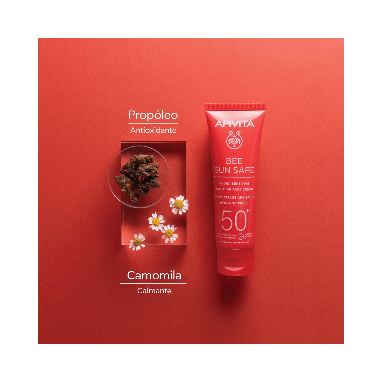 Apivita Bee Sun Safe Hydra Sensitive Facial Calmante SPF50+ 50ml é um creme facial com proteção solar de alto espectro, formulado à base de ácido hialurônico, alga marinha e aloe. SPF50.