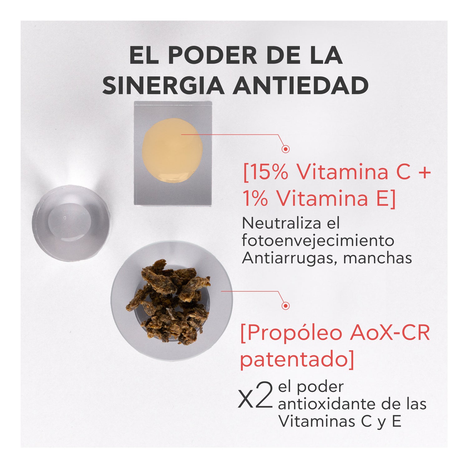 Sua incomparável eficácia foi demonstrada frente ao dobro do poder antioxidante da Vitamina C + E, reforçando os resultados antienvelhecimento dessa combinação sinérgica. Sua textura leve e rápida absorção garantem um acabamento luminoso, suave e não oleoso na pele.