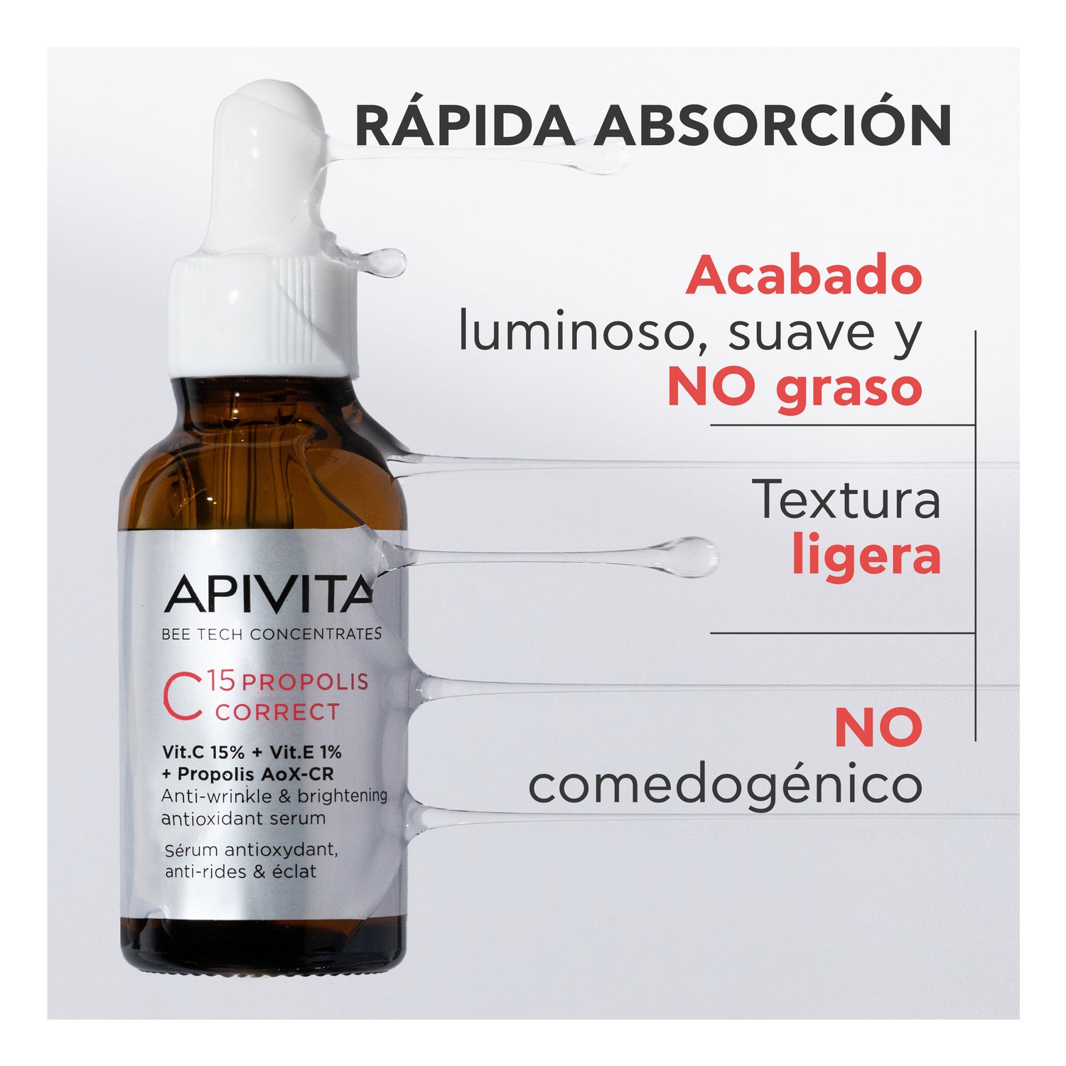 Sérum Corretor C15 Própolis revela o poder da sinergia antienvelhecimento da Vitamina C, da Vitamina E e do Própolis Aox-CR patenteado. Oferece uma proteção oxidativa graças a 15% de Vitamina C pura estabilizada e 1% de Vitamina E. A potente eficácia desses dois ativos dermatológicos mais reconhecidos é reforçada pelo exclusivo Própolis AoX-CR patenteado da APIVITA.