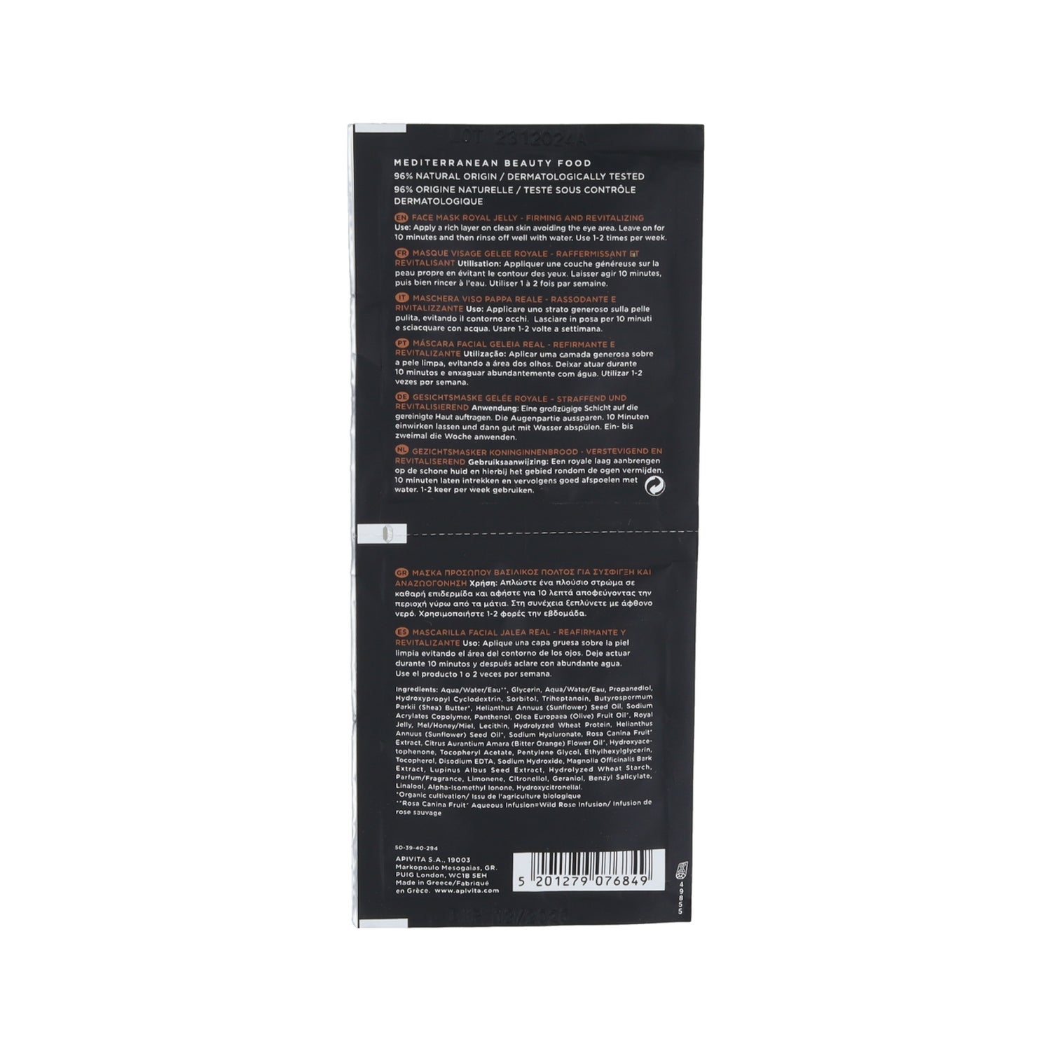 Máscara facial hidratante que promove a nutrição e a firmeza da pele. Formulado com mel de tomilho, azeite, manteiga de karité, ácido hialurónico e proteínas de trigo, que ajudam a manter níveis óptimos de hidratação da pele. Contém 100% de infusão de chá de montanha grego orgânico com acção antioxidante e extracto de zizifo, o que proporciona um efeito de aperto. Com geleia real encapsulada em lipossomas, o que ajuda a firmar os contornos do rosto. Dermatologicamente testado. Livre de óleo mineral, parabenos e silicones. Adequado para todos os tipos de pele, mesmo a pele sensível.