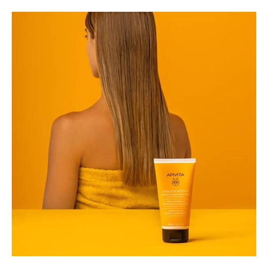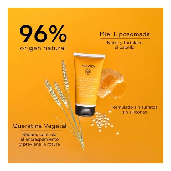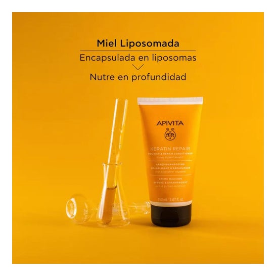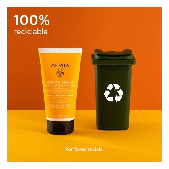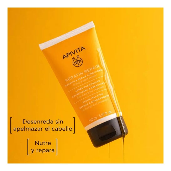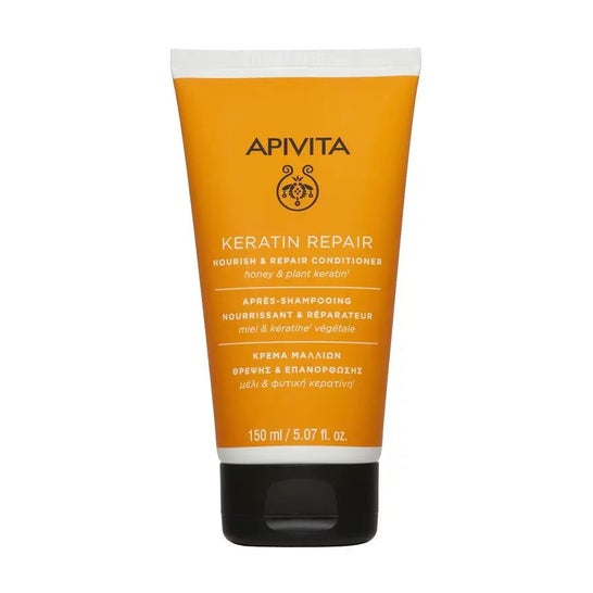 Apivita Keratin Repair Conditioner 150ml é um produto nutritivo e reparador para cabelos secos e danificados. Graças à sua fórmula com queratina vegetal e mel, ajuda a nutrir profundamente o cabelo desde o interior, eliminando o frisado, as pontas espigadas e a quebra do cabelo. Para utilizar o Condicionador Nutritivo e Reparador Apivita Keratin Repair 150ml, basta aplicar após o champô, do meio para as pontas, deixar atuar durante 2-3 minutos e enxaguar abundantemente. Evitar o contacto com os olhos e utilizar apenas externamente. Entre os seus principais ingredientes encontram-se queratina vegetal, mel, proteínas de trigo, soja e milho, azeite, óleo de amêndoas doces, óleo de girassol, extrato de alecrim, sumo de folhas de aloé vera, pantenol, óleo essencial de flor de laranjeira amarga e óleo essencial de lavanda. É importante ter cuidado com o contacto com os olhos e lembrar que este produto se destina a uso externo. Para além disso, a lista de ingredientes pode variar, pelo que se recomenda que se verifique sempre a lista no produto adquirido.