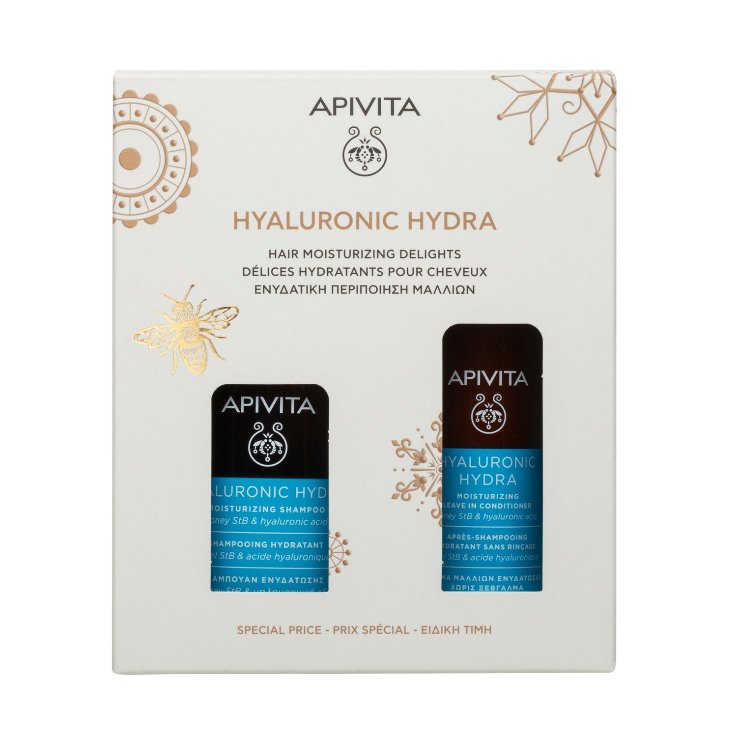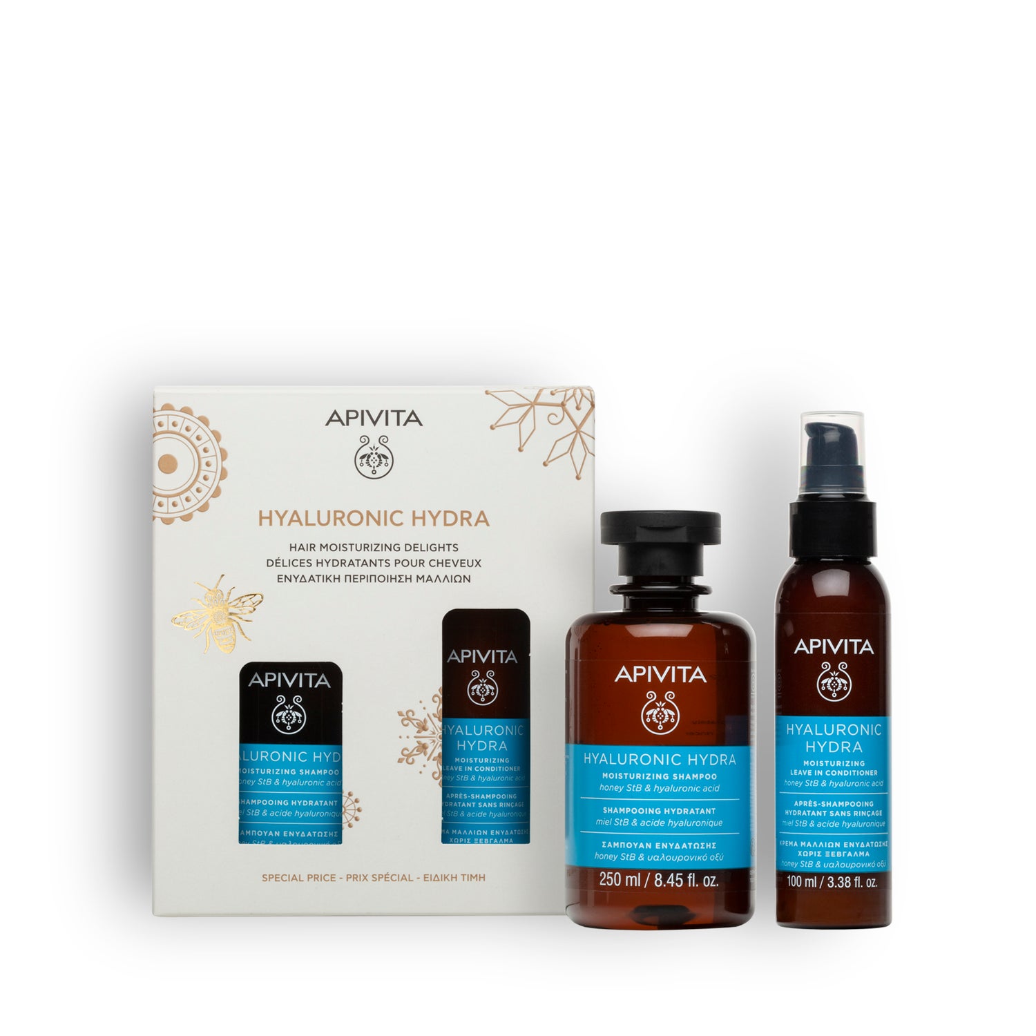 Apivita Pack Hyaluronic Hydra Shampoo 250ml + Condicionador 100ml contém um shampoo e um condicionador que hidratam e suavizam o cabelo.