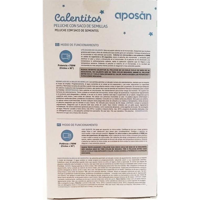 O Aposan Calentito Peluche Oso deve ser guardado em um lugar limpo e seco após cada uso. Deve-se ter em mente que o saco de sementes não é lavável, enquanto o exterior do peluche pode ser limpo seguindo as instruções do fabricante. Este produto é ideal para o lar, oferecendo tanto conforto quanto uma solução prática para o alívio de pequenas molestias.