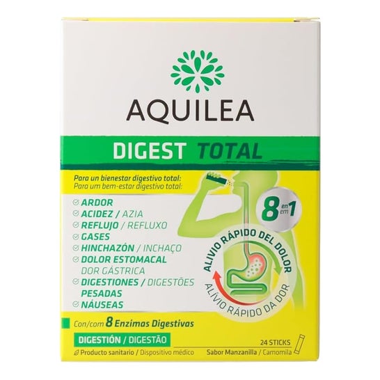 Aquilea Digest Total Sabor Manzanilla 24x2,5g é um produto projetado para aliviar diversas molestias digestivas. Este multissintomas se apresenta em cómodas saquinhos e atua de maneira rápida para combater até oito sintomas relacionados com a digestão.