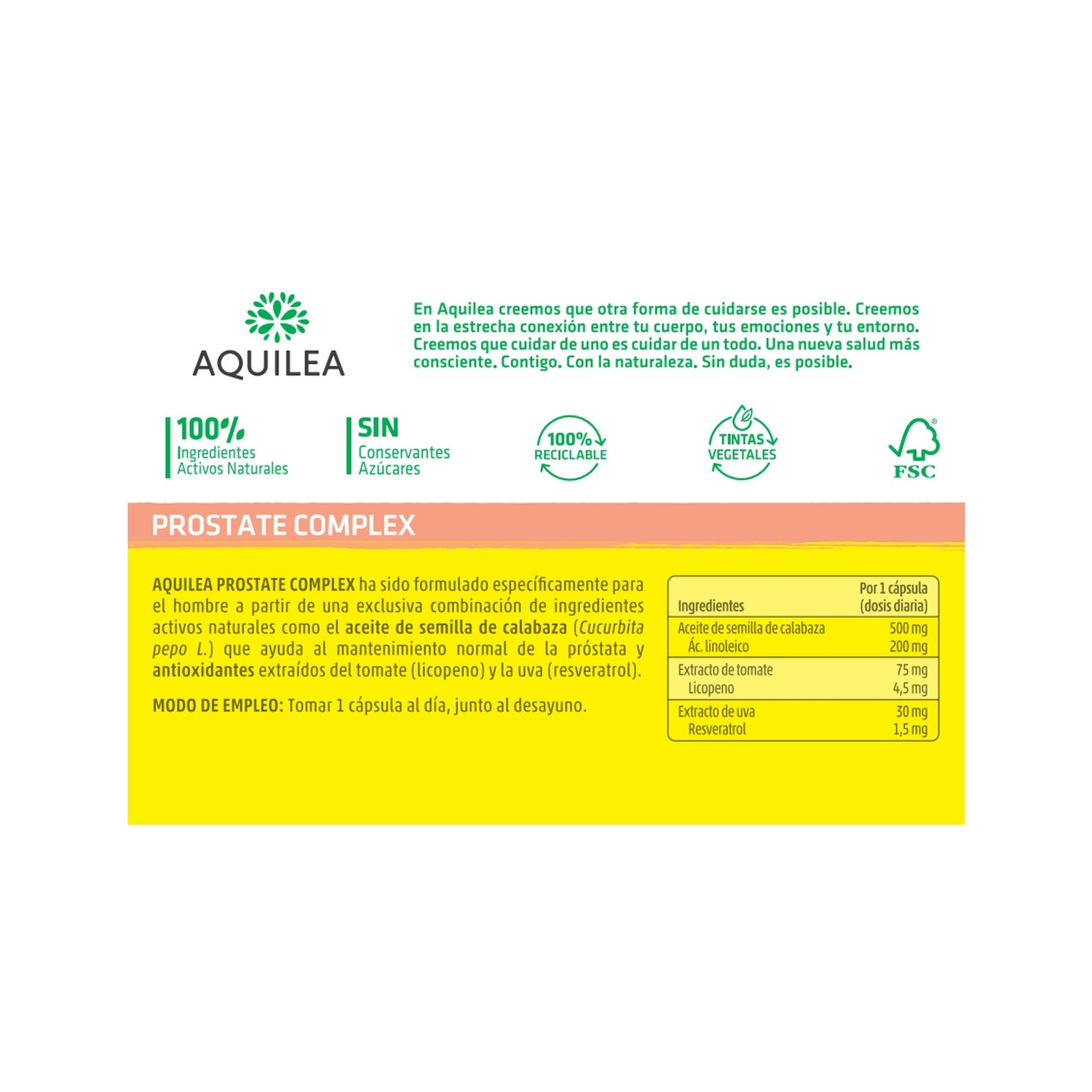 Aquilea Prostate cápsulas cuja fórmula combina vários ingredientes naturais com propriedades antioxidantes para melhorar a condição e a saúde da próstata.