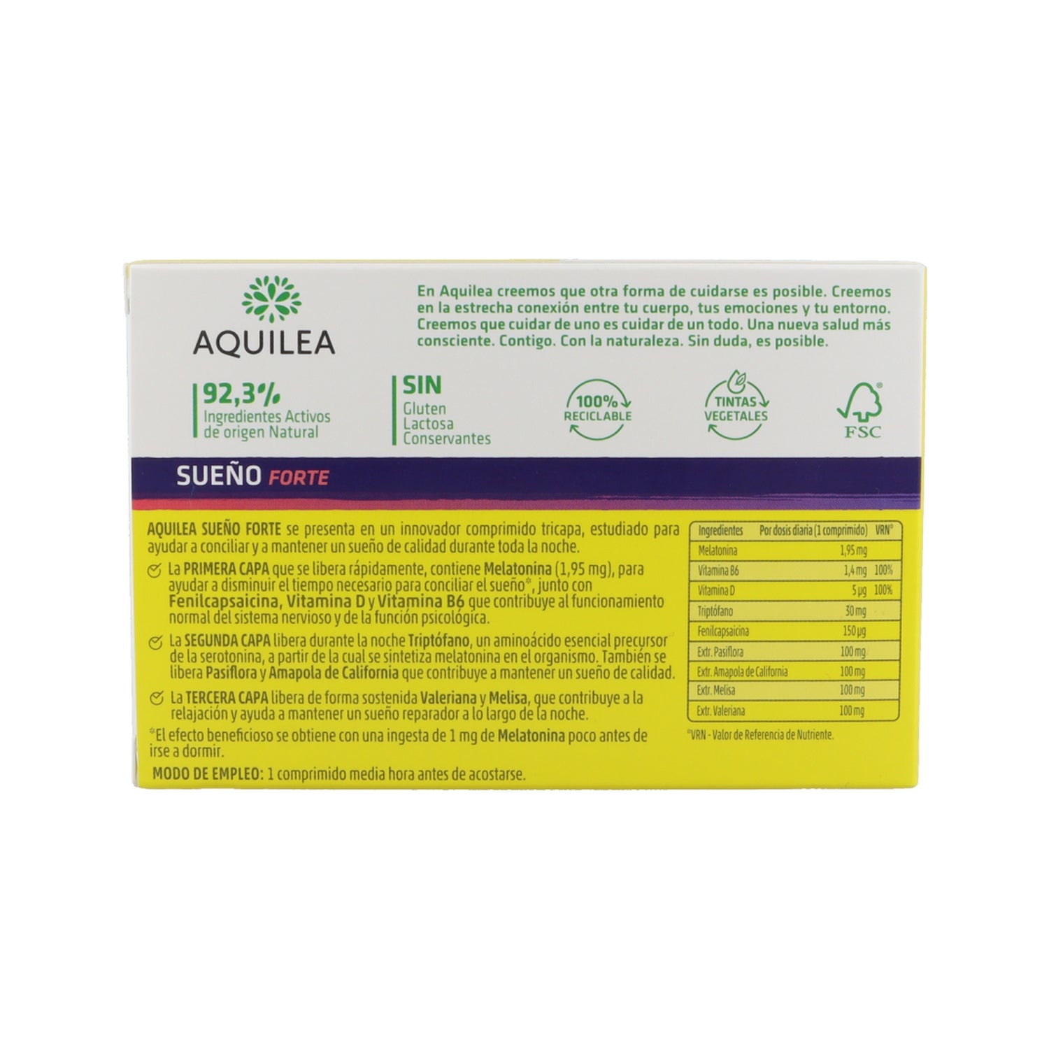 Aquilea Sueño Forte 60comp é um suplemento alimentar que ajuda a adormecer e a manter o sono. A sua fórmula é libertada em 3 fases, a primeira contém Melatonina, Piperina, Vitamina D e B6, e ajuda a reduzir o tempo necessário para adormecer. A segunda camada contém Griffonia (5-HTP) que ajuda a sintetizar a Melatonina no organismo. Contém igualmente passiflora e papoila da Califórnia para ajudar a manter o relaxamento e o sono. Finalmente, a terceira camada contém Valeriana e Melissa, que são libertadas de forma sustentada para relaxar o corpo e contribuir para um sono mais repousante, e são indicadas para ajudar a adormecer e a manter o sono.