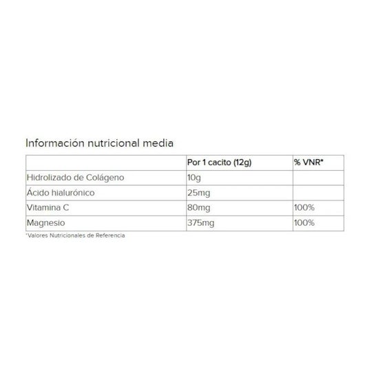 Hidrolisado de colagénio - Vitamina C - Hialuronato de sódio - Óxido de magnésio. 1 concha contém: Colagénio Hidrolisado 10g, Ácido Hialurónico 25mg, Vitamina C 80mg, Magnésio 375mg.