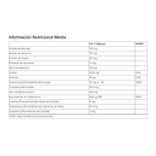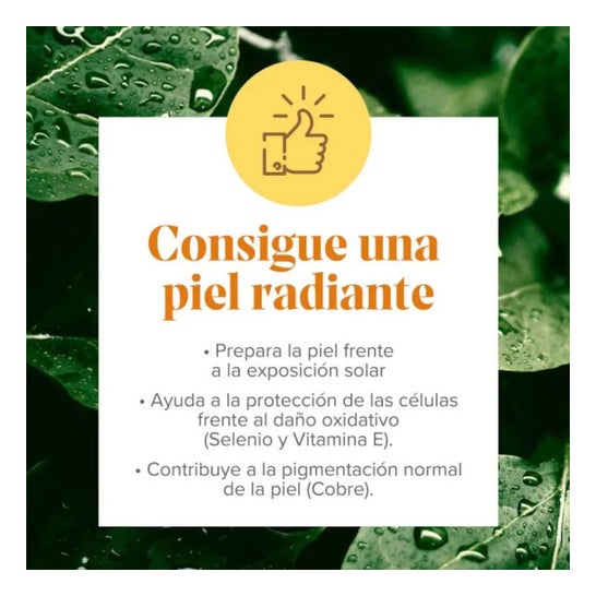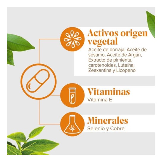 Feito com selénio, que minimiza os danos oxidativos às células devido à exposição aos raios solares , e cobre, que prolonga o bronzeado da pele. Além disso, o extracto de óleo de argão, que permite à derme manter a sua elasticidade e firmeza, e o óleo de borragem, que reduz a perda de humidade da pele e dá um brilho extra ao bronzeado. A vitamina E ajuda a retardar os sinais de envelhecimento e cria uma barreira protectora contra a poluição e os radicais livres.