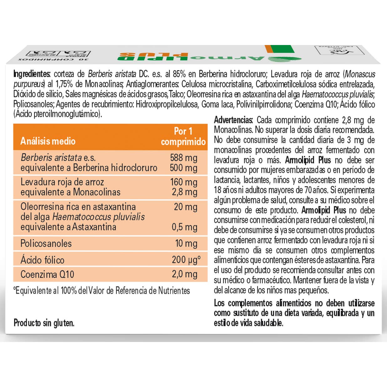 Armolipid Plus 30caps é um complemento alimentar que ajuda a manter o colesterol em níveis normais. Além disso, ajuda a normalizar o metabolismo da homocisteína, graças ao seu alto conteúdo em ácido fólico. Ademais, seu conteúdo em arroz vermelho fermentado com monacolina K*, contribui para reduzir os níveis de colesterol no sangue. Por fim, está enriquecido com coenzima Q10 de efeito antioxidante. Contém 30 cápsulas. *Com 2,8mg de monacolinas por dose diária.