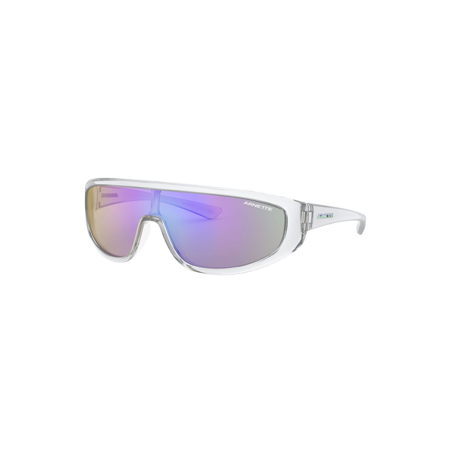 Óculos de sol unissex com uma forma rectangular. A sua estrutura de resina transparente tem um alto encaixe de ponte. Os seus templos são largos, do mesmo material e cor, apresentando o nome da marca em letras de prata em cada um deles. As lentes de plástico azul espelhado oferecem um filtro solar de categoria 3, ajudando a proteger os seus olhos dos raios solares com a máxima eficiência. Inclui um estojo de marca.