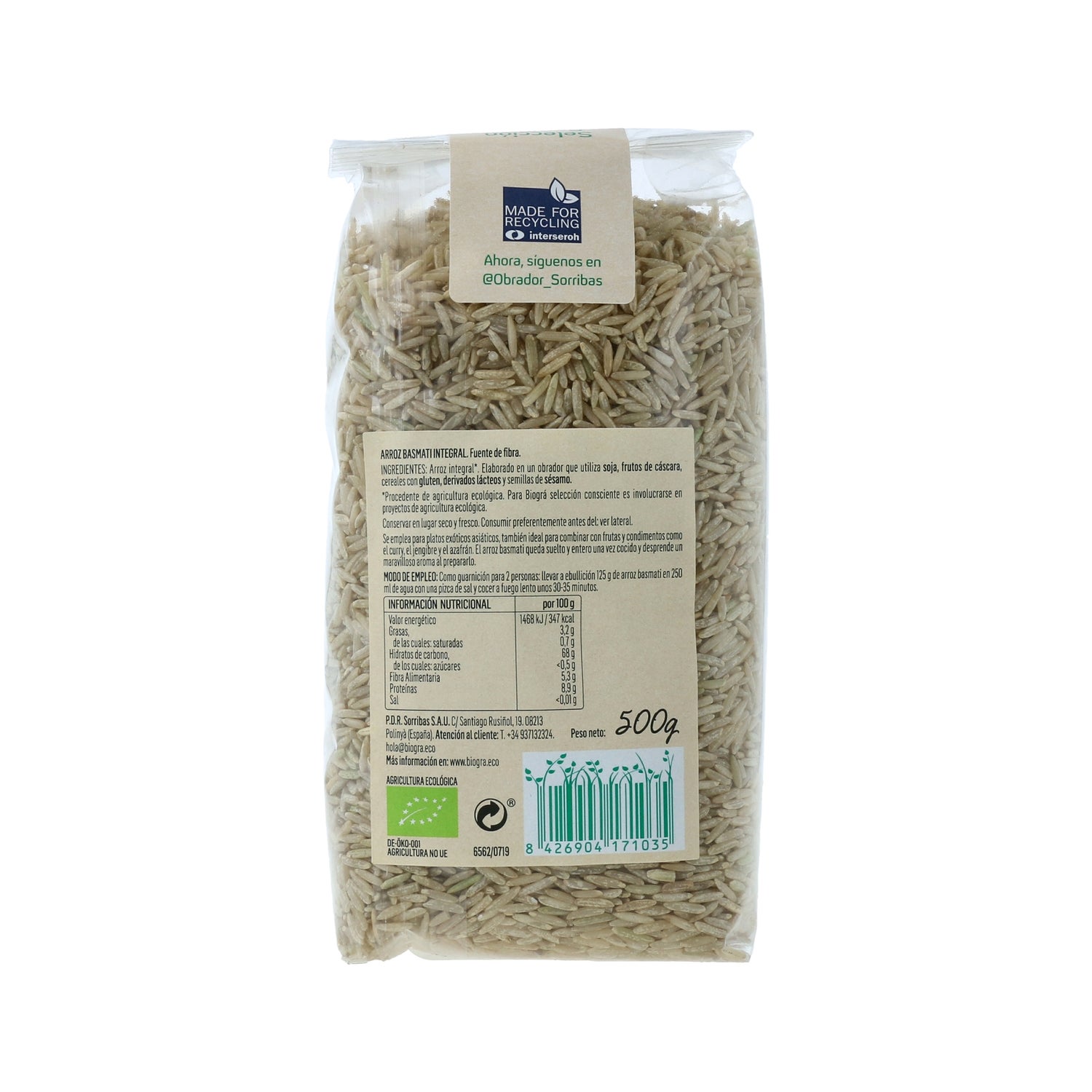 É arroz basmati integral da marca Bioga, em formato de 500g. É um arroz de grão longo e de grande consistência. Contém proteínas e minerais como o manganês para ativar o metabolismo de proteínas e carboidratos. Com ferro, selénio, cálcio, potássio e cobre. Não contém gorduras nem sódio. Contém vitaminas B, como B1, B3, B6, B2, B5, B8 e B9. Fornece antioxidantes devido ao seu teor de vitamina E, também contém vitamina K que fornece nutrientes ao sangue. Indicado para consumo diário.