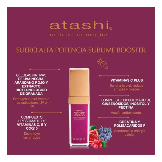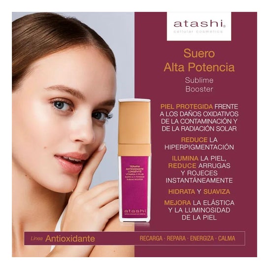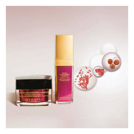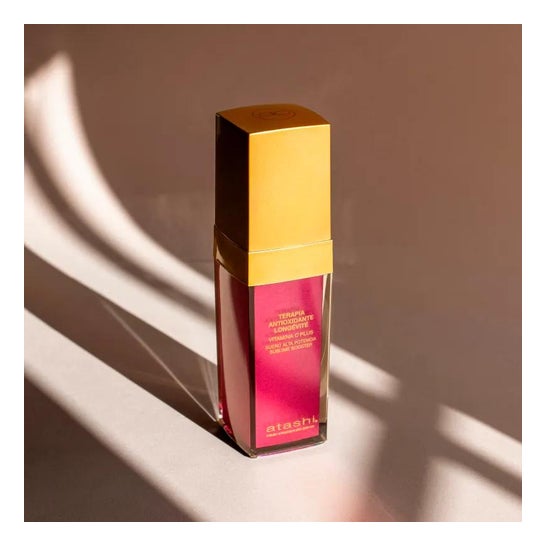 Atashi® Terapia Antioxidante Longévité Serum Booster Vitamin C Plus 30ml é um tratamento antioxidante concentrado com polifenóis da mistura de Bourgogne e Cranberry Black Grape Vegetable Stem Cells e Extrato Biotecnológico de Romã. Todos eles têm propriedades antioxidantes, que neutralizam os danos produzidos pelos radicais livres. Além disso, são capazes de formar uma camada que ajuda a retardar o envelhecimento e a restaurar os danos produzidos pela radiação solar e pela poluição.