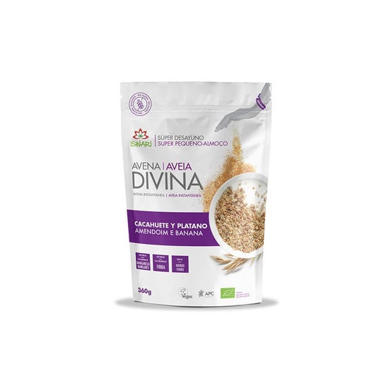 Aveia Iswari feita com aveia, amendoim e banana. O produto é ideal para preparar as tuas papas de aveia de forma instantânea e rápida (sem necessidade de cozinhá-las). Além dos flocos de aveia sem glúten, esta mistura é enriquecida com a textura do amendoim e o sabor delicioso e doce da banana, resultando numa combinação ideal para snacks. Contém: flocos de aveia (sem glúten), trigo sarraceno moído, manteiga de amendoim, banana em pó, açúcar de coco, sementes de chia moídas, sementes de linhaça moídas, trigo sarraceno ativado e amoras brancas. O produto é uma fonte de ferro, alto teor de manganês, magnésio. Alto teor de gorduras monoinsaturadas e fibra. Produto sem glúten, vegano e sem lactose.