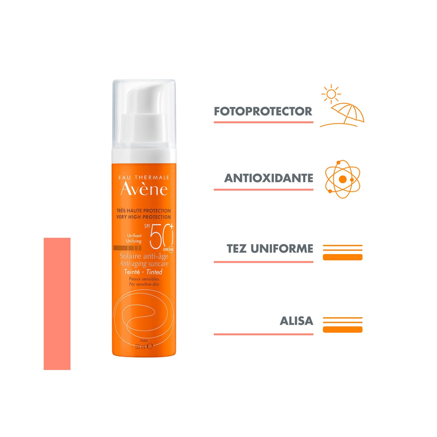 Avène Solar Antiage 50+ Colour 50Ml oferece uma protecção de largo espectro contra UVB-UVA sem deixar um resíduo branco.