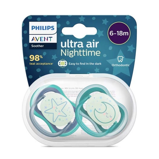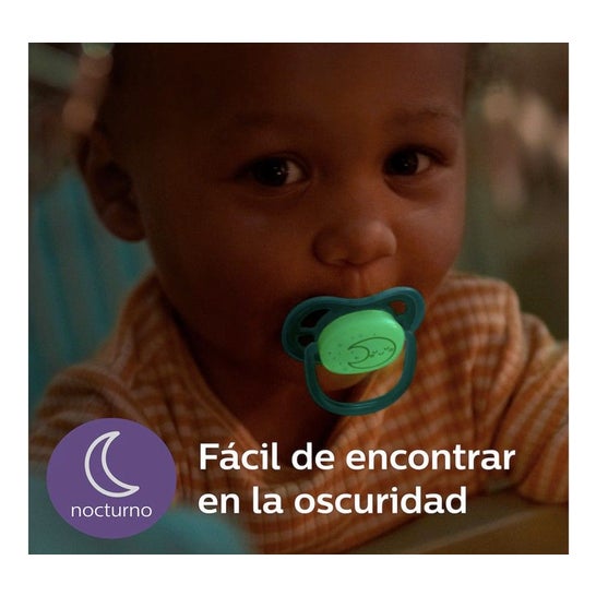 Avent chupeta noturna é especialmente indicada para utilizar durante as horas de sono no escuro. A sua pega de segurança exclusiva em forma de argola brilha no escuro, permitindo que o seu bebé encontre sozinho a sua chupeta, ou ajudando-o/a a encontrá-la sem acender a luz do quarto.