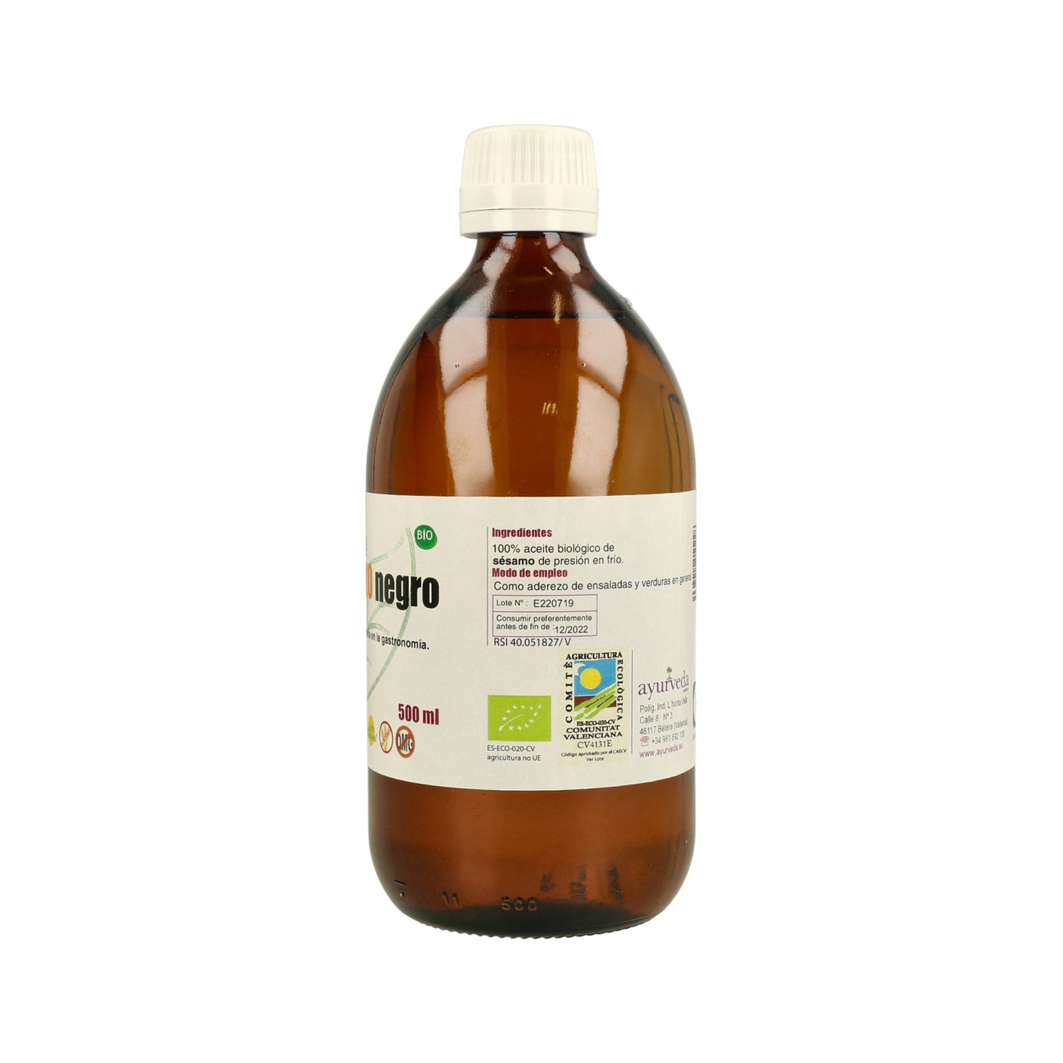 Óleo de sésamo preto extra virgem, adequado para uso gastronómico. Com ação anti-inflamatória