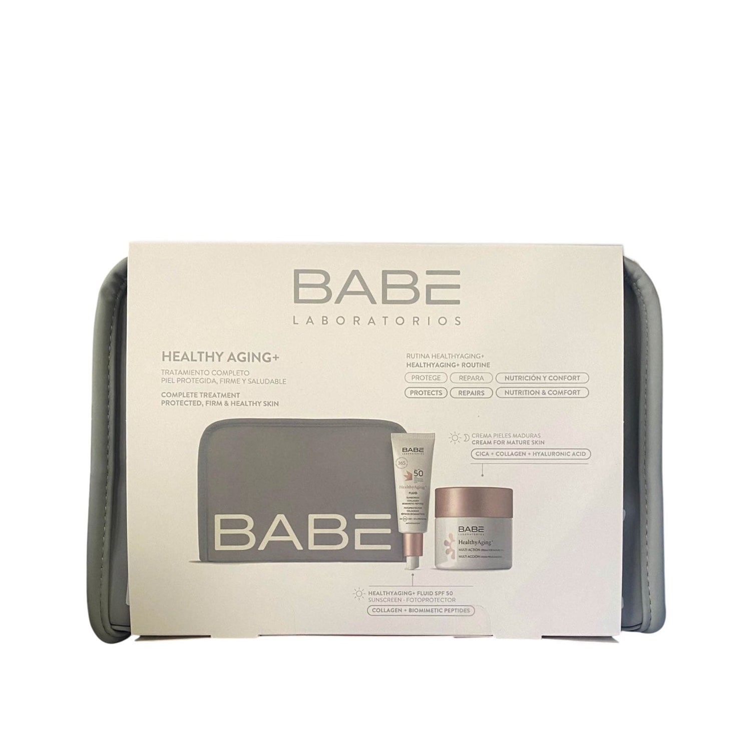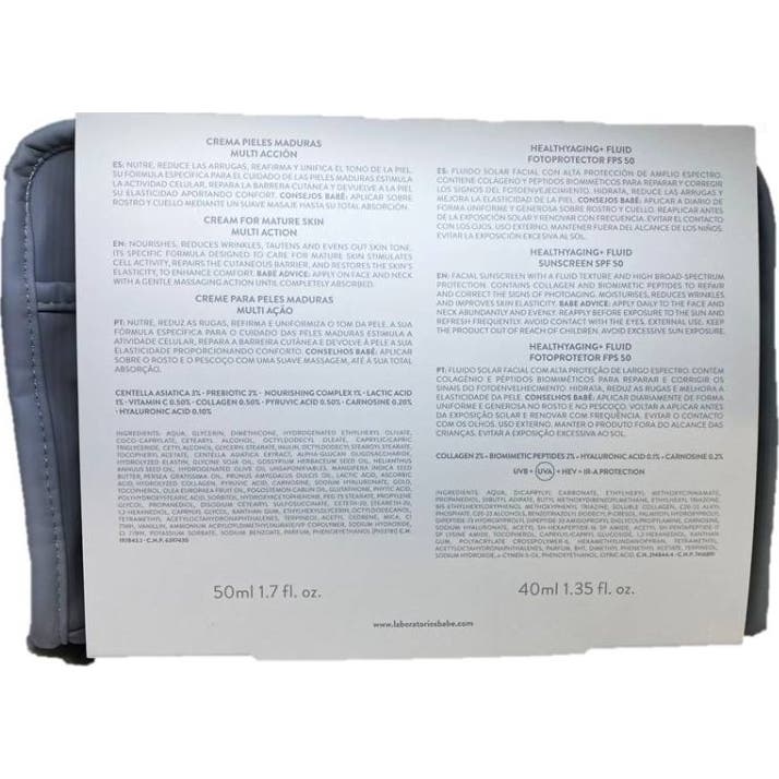 Babé Pack Healthy Aging+ Rotina Multi Ação + Fluido SPF50 para peles maduras reúne uma rotina diária completa para nutrir, reafirmar e hidratar a pele, com proteção contra o envelhecimento precoce. Inclui: