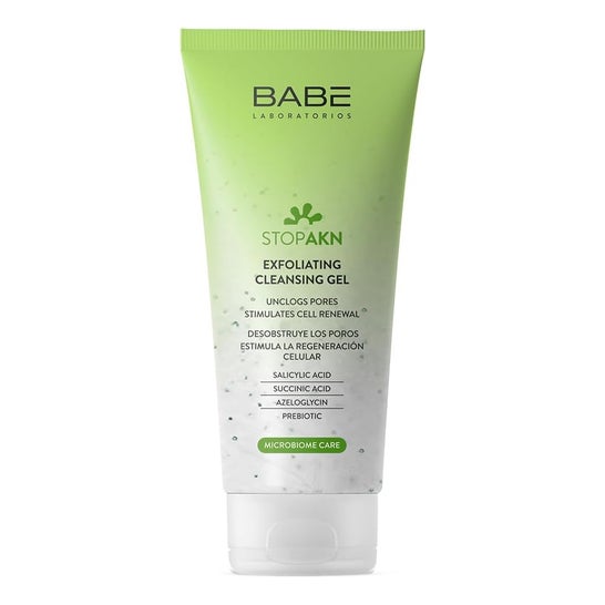 Babe Stop Akn Gel Limpiador Exfoliante 200 ml é um gel de limpeza esfoliante indicado para peles oleosas, mistas ou com tendência a acne. Ajuda a eliminar impurezas em profundidade e a controlar o excesso de sebo, respeitando a barreira natural da pele. É adequado para adolescentes e adultos.