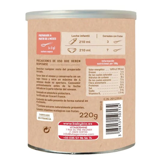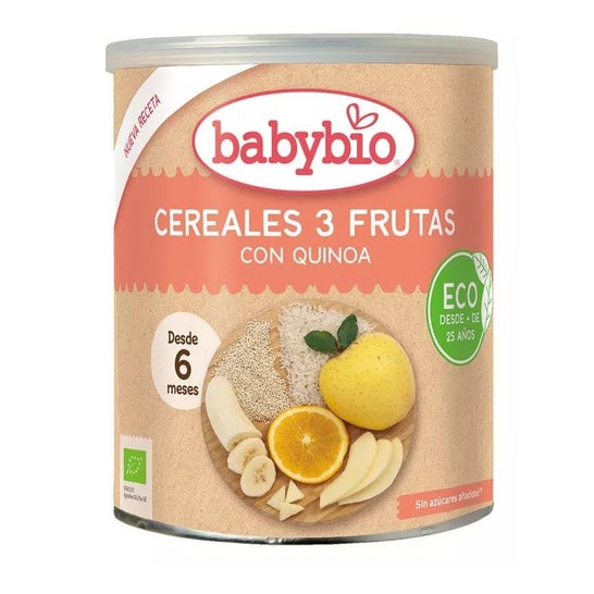 Papas de cereais e frutas biológicas que ajudam a proporcionar múltiplos benefícios às crianças a partir dos 6 meses de idade. Contém quinoa, frutos: banana, laranja e pera, provenientes de agricultura biológica e também vitamina B1. A quinoa é rica em proteínas, minerais e fibras, com um teor excecional de aminoácidos essenciais. Formato de 200g.