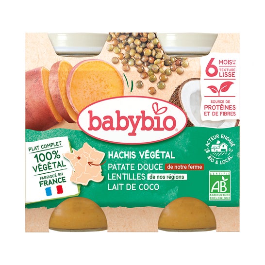BabyBio Hachis Vegetal Boniato Lentejas Leche Coco 6M+ 2x200 g é um alimento para bebês que combina ingredientes biológicos cuidadosamente selecionados. Este produto foi projetado para oferecer uma opção nutritiva e saborosa, ideal para os menores a partir de seis meses.