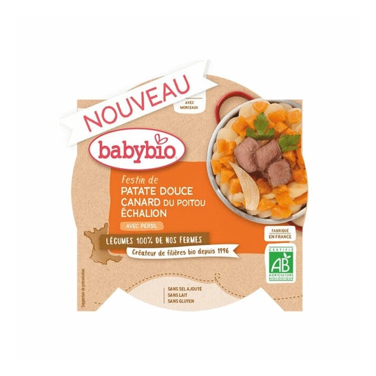 Compota para bebês elaborada a partir de ingredientes ecológicos certificados, à base de batata-doce, pato, alecrim e chalota. Apta como primeira alimentação sólida, aporta os nutrientes necessários para um crescimento adequado.