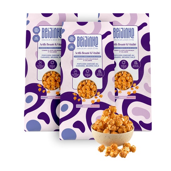 Beijinho Pack Trio Pipocas Caramelo Manteiga Salgada Ativos Beleza & Vitalidade 3x38,5g são grãos de pipocas crocantes cobertos com um caramelo de manteiga salgada derretido, enriquecidos com vitamina D3, ácido hialurônico e colágeno, que contribuem para a luminosidade da pele, a hidratação e o bem-estar geral.