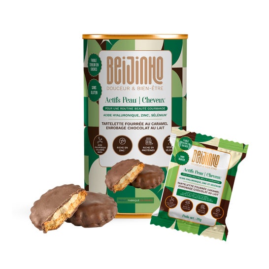 Beijinho Tartelette Chocolate com Leite e Caramelo Piel & Cabelo 208g são tartaletas recheadas de caramelo e cobertas de chocolate com leite, enriquecidas com ácido hialurônico, zinco e selênio, que favorecem a hidratação, reforçam a barreira cutânea e apoiam a saúde capilar.