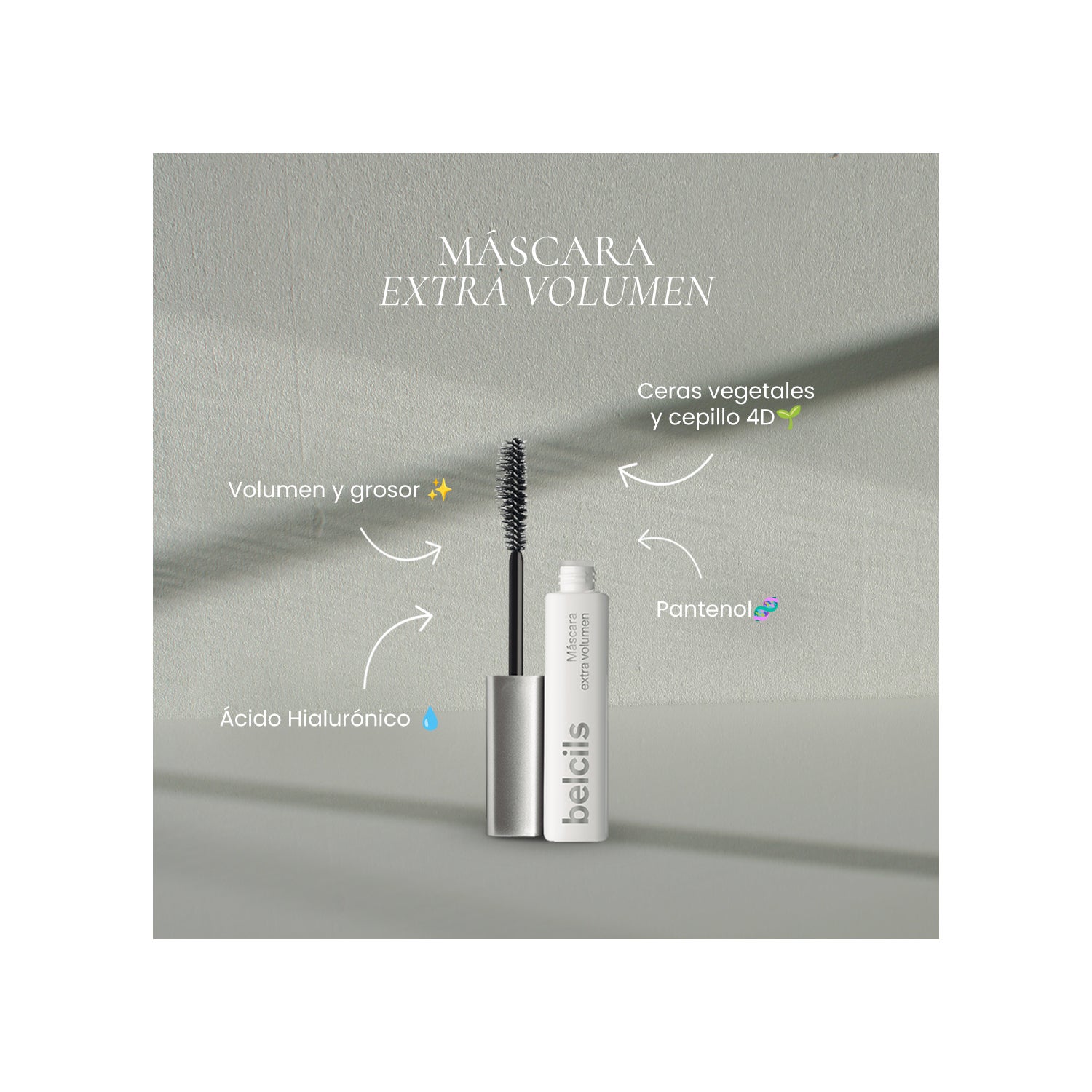 Belcils conseguiu uma fórmula muito eficaz para lograr pestanas espessas e longas: máscara extra volume. Graças a esta mistura de maquiagem e quitina, substância presente na cutícula e carapaças dos crustáceos marinhos, tus pestanas conseguirão um efeito de volume ideal.