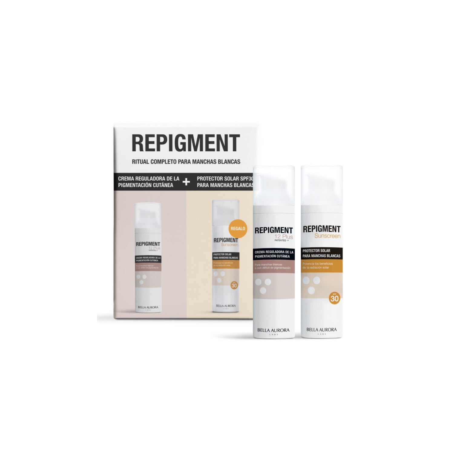 Bella Aurora Repigment 12 Plus 75 ml + Repigment Sunscreen 75 ml para manchas brancas é um pack com um creme repigmentante e um protetor solar específico. Está indicado para ajudar a regular a pigmentação da pele e favorecer um tom mais uniforme em casos de hipopigmentação, como manchas brancas no rosto e no corpo.