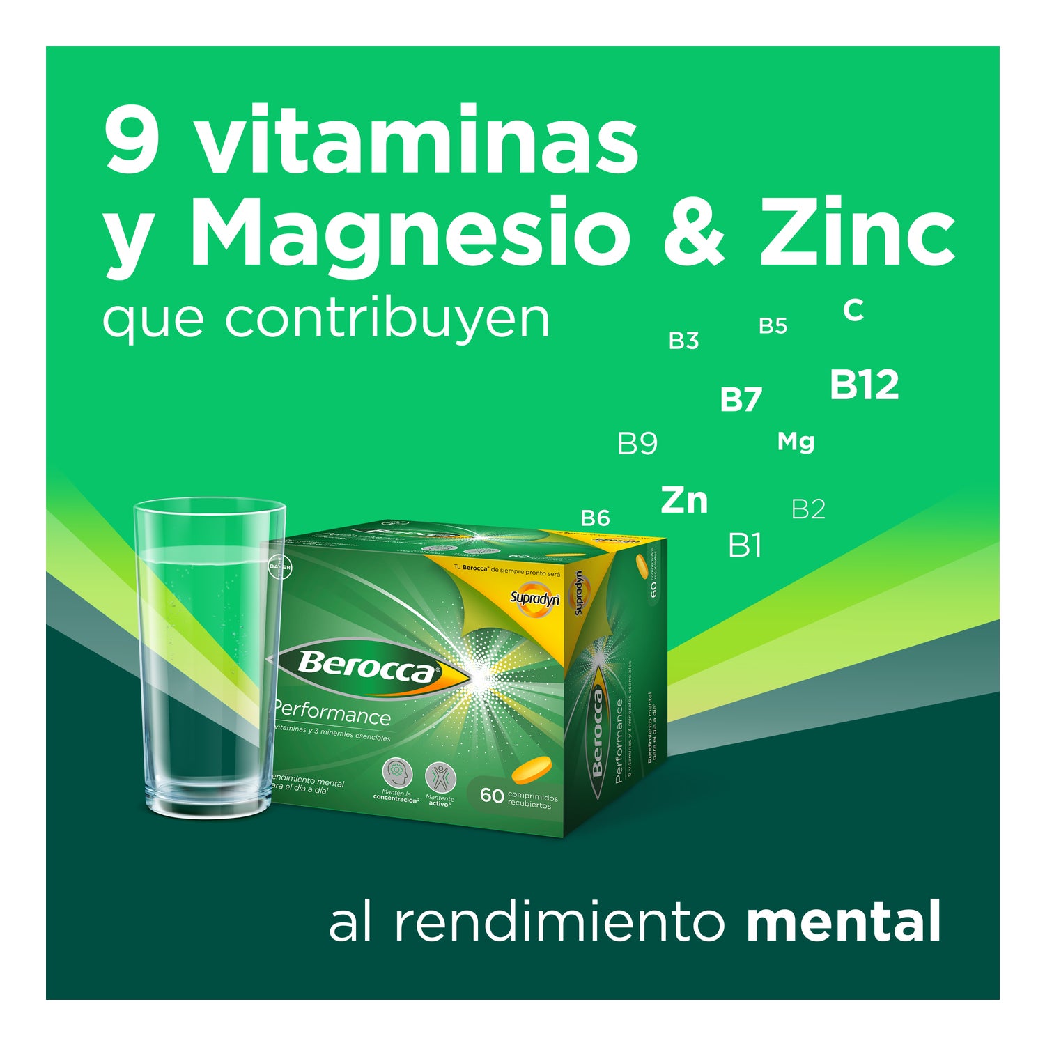 Berocca Performance Vitaminas e Desempenho 60comp é um suplemento alimentar que combina vitaminas do grupo B, vitamina C e minerais essenciais como o magnésio ou o zinco.