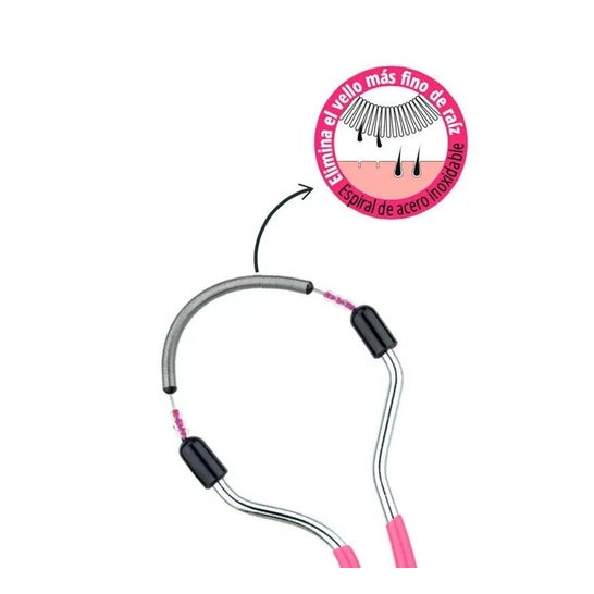 Instrumento cosmético para a depilação facial, feito com uma espiral de aço inoxidável que prende eficazmente até os pêlos mais finos. Tem uma pega com uma superfície de plástico, o que ajuda à correcta aderência e melhora os resultados. Adequado para a área dos lábios, queixo e bochechas.