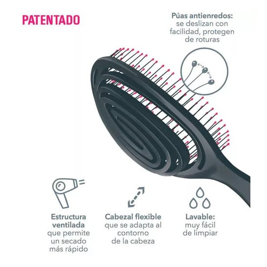 A Beter Elipsi Flexible Brush Large Fuchsia é uma escova de cabelo com uma cabeça adaptável que facilita o desembaraçar sem danificar o cabelo. O seu design ventilado ajuda a secar o cabelo mais rapidamente, tornando-a ideal para cabelos compridos ou muito compridos. Pode ser utilizada tanto em cabelos húmidos como secos.